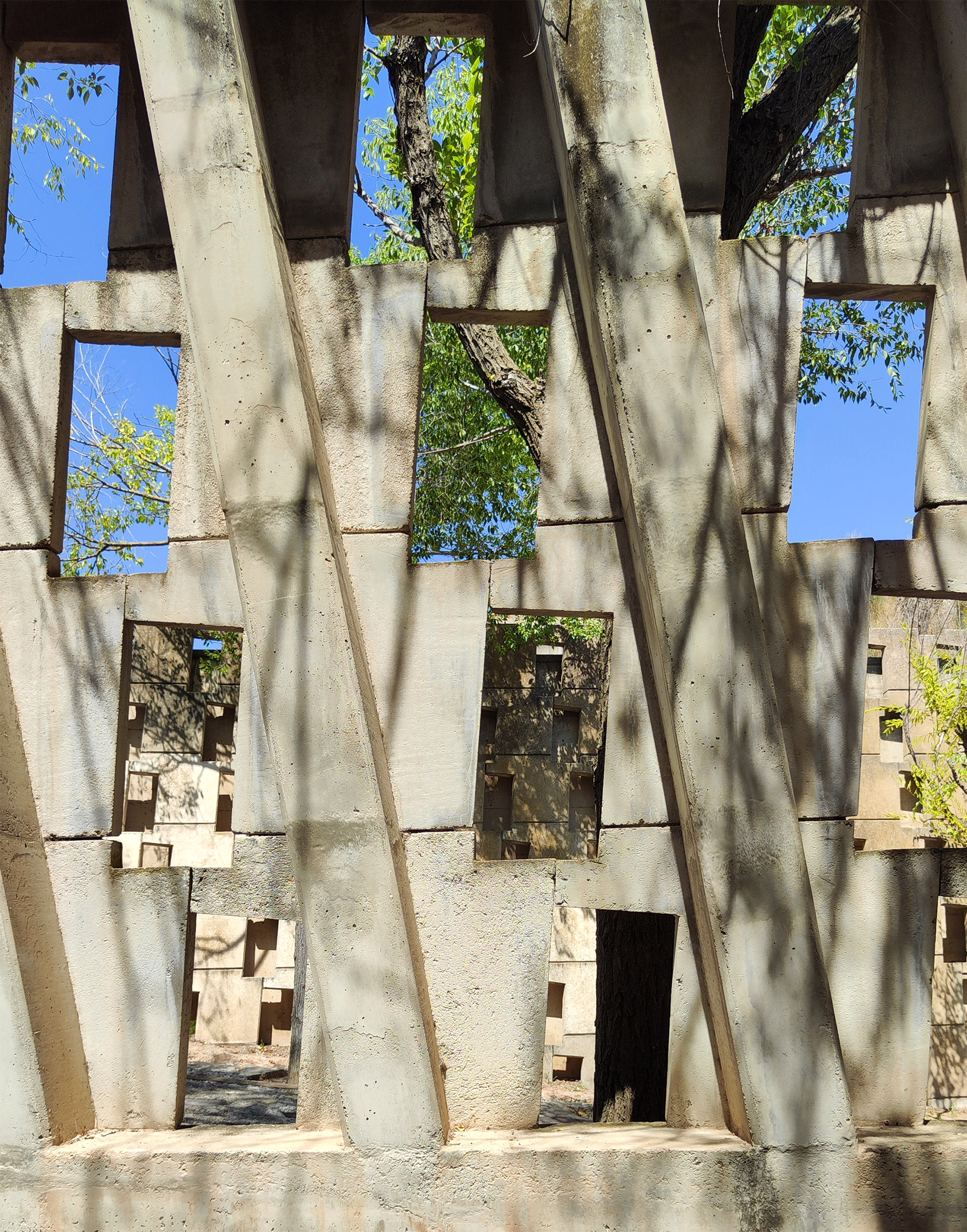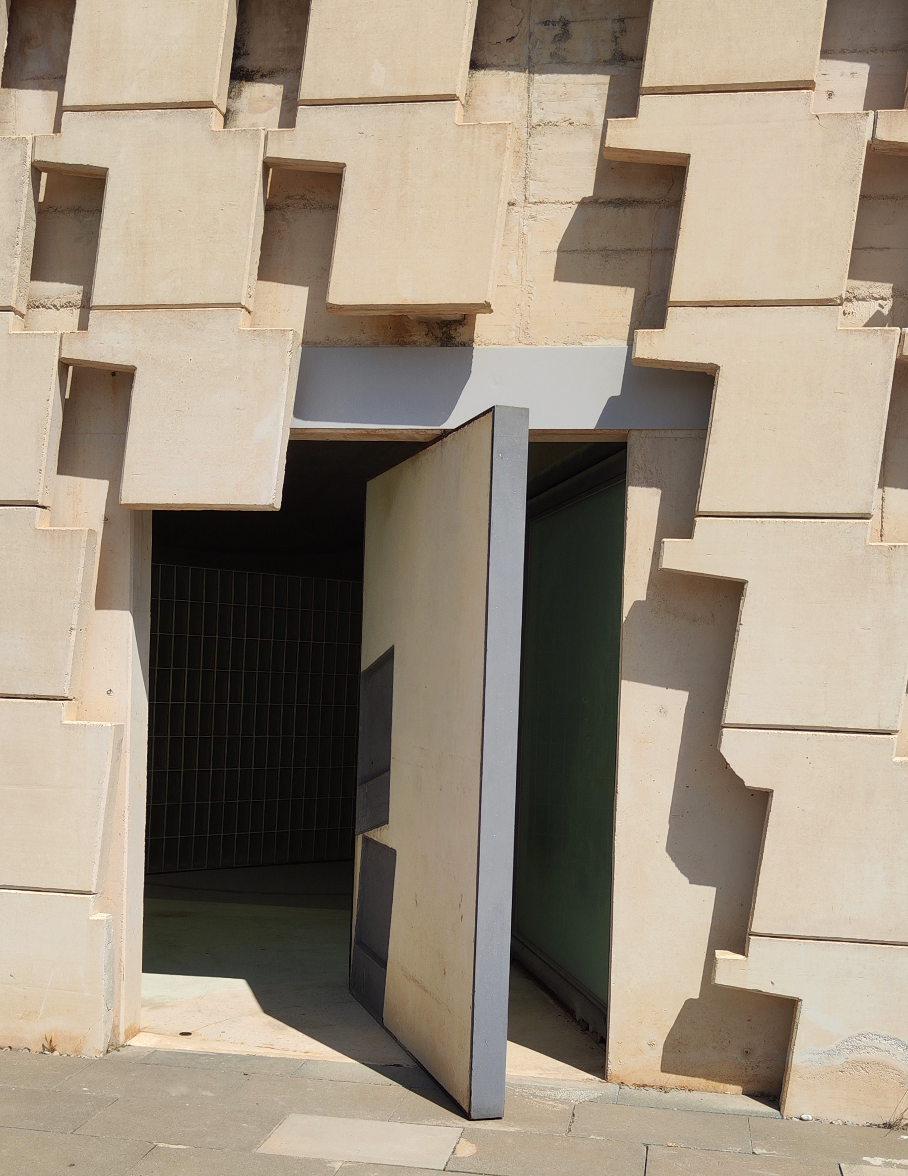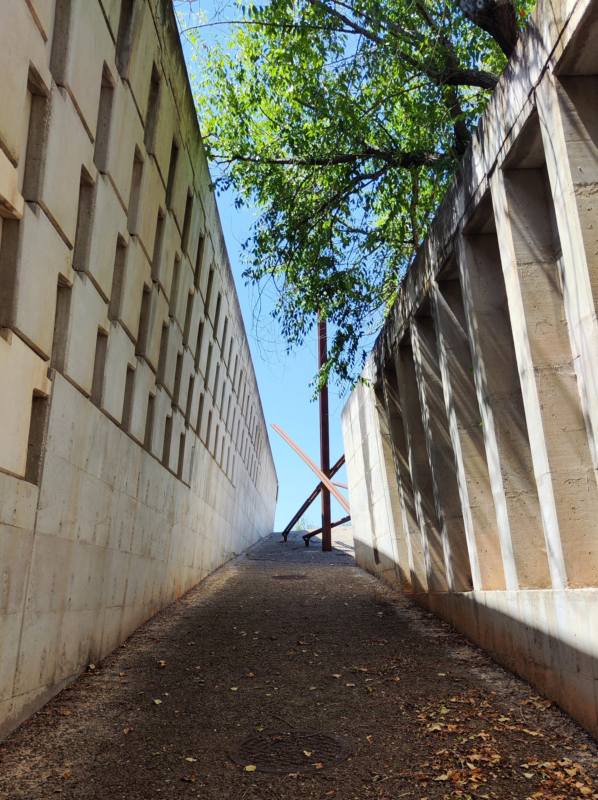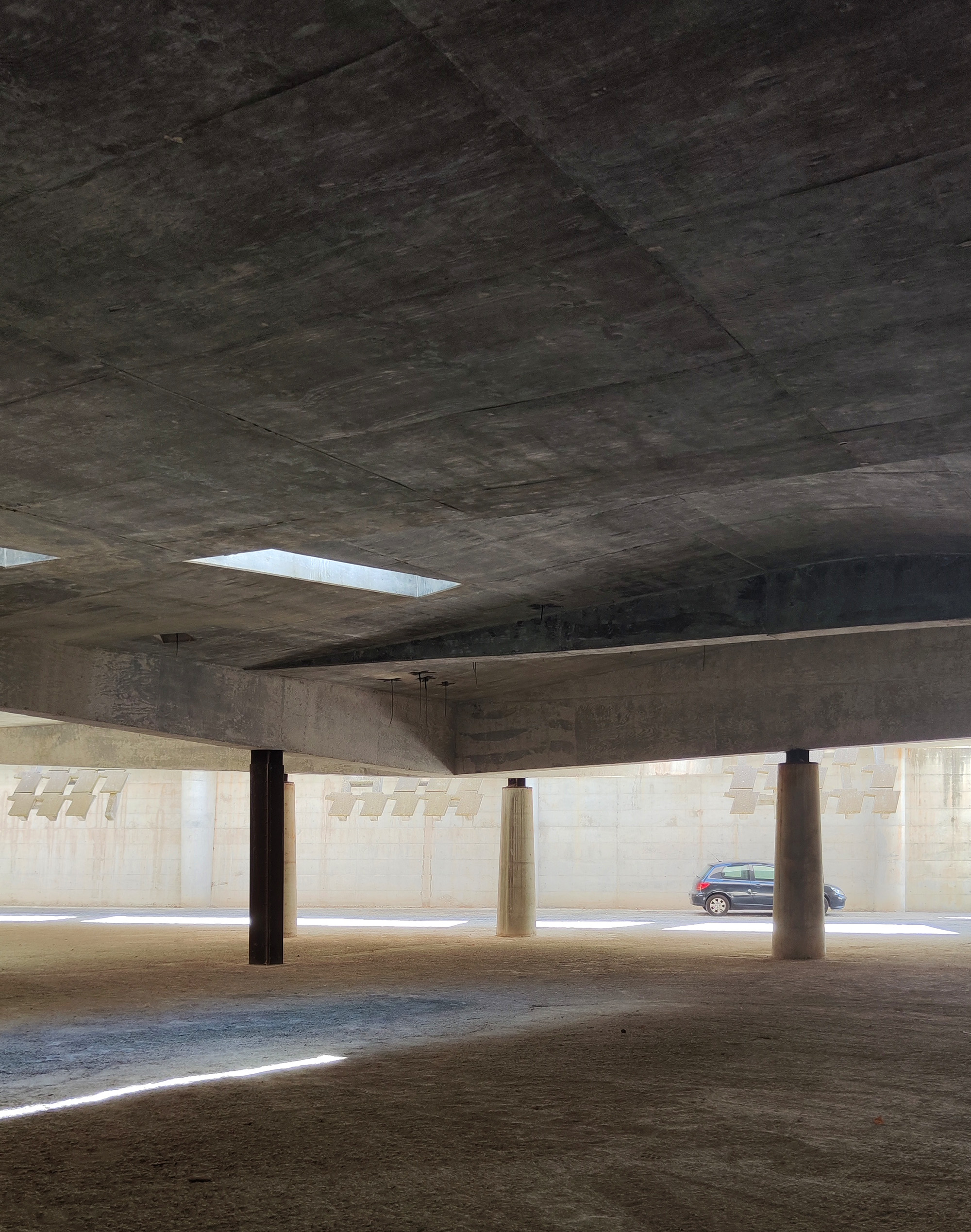 The way in which different states of time are expressed through shapes is perhaps one of the most important insights I gained from the Igualada project. For example, I chose an extreme zigzag geometry for the cemetery’s layout so that its radical and abstract shapes would differentiate it from the layout of a town, which is constructed according to very different rules. This radical geometry was shown to leave visitors with the impression of moving through a timeless space. The incision represents absolute time, while its different details materialise the measurable flow of time: the small almond trees between the cars at the entrance, the laurel bushes along the access ramps, the bare earth in front of the different buildings, the small shrubs and the different types of poplars that seal the incision in the ground with their small, silvery leaves. The slightest breeze makes them move and shine in the sun. Then the ground covered with mass-produced cement, in which old planks have been submerged, reminiscent of driftwood carried by the river, seems to be sliding downhill. Time can be perceived in all these elements as their appearance is altered by the changing position of the sun throughout the day and the year. These things are familiar to us, they give us orientation. By this I mean that we can obtain different forms of nature, those connected with time, and those that are outside of it.