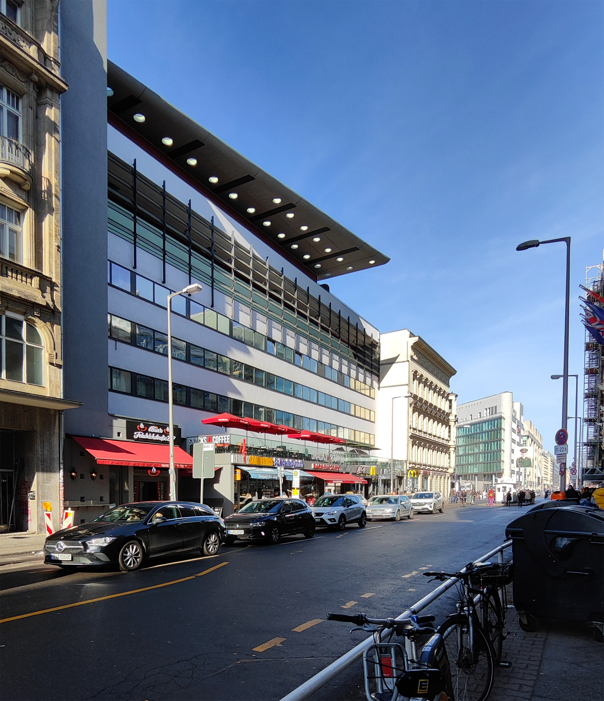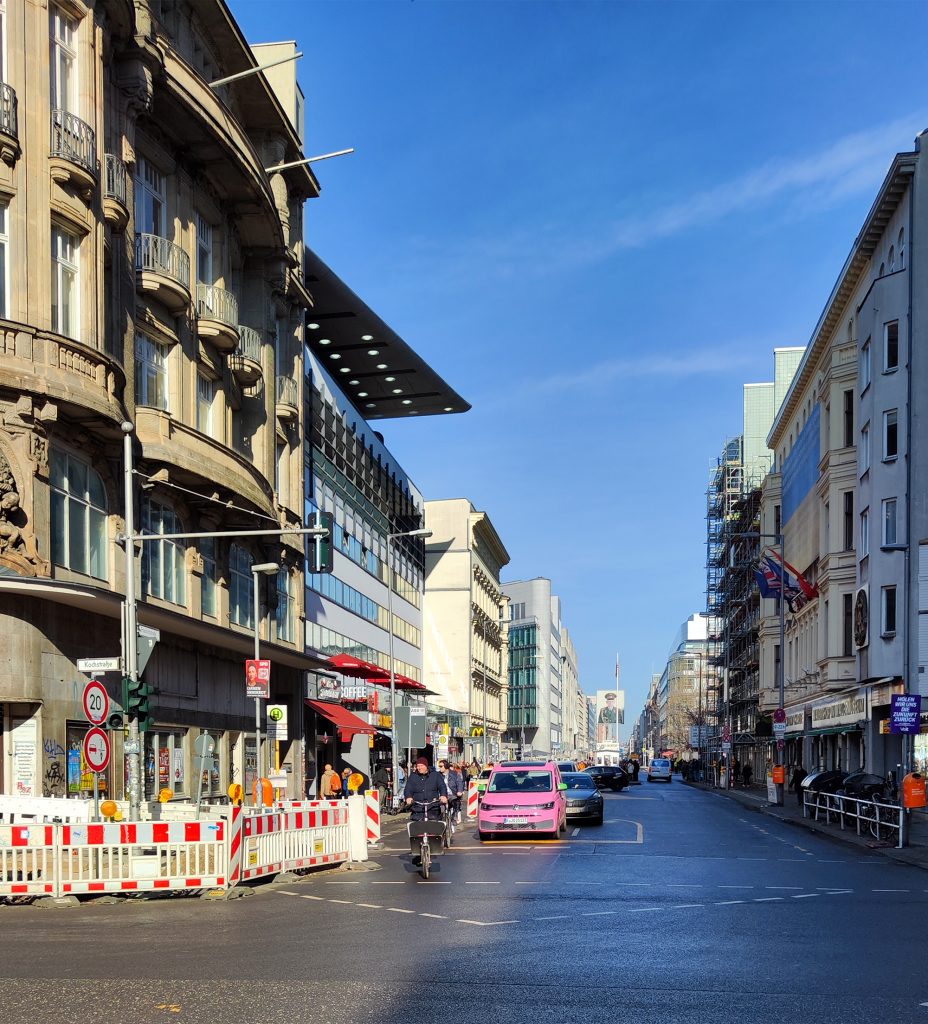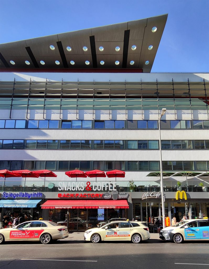 El encargo se basó en dos proyectos presentados por OMA al concurso Internationale Bauaustellung (IBA) en 1981. El programa incluye 26 apartamentos de tres tipos diferentes: 1. Áticos. 2. Apartamentos de tres plantas a los que se accede desde una galería de doble altura. 3. Dúplex con acceso al jardín. Los apartamentos se sitúan en un podio sobre las nuevas instalaciones del Checkpoint para los trabajadores de aduanas y las fuerzas aliadas. El edificio se terminó poco después de la caída del Muro de Berlín. El emplazamiento se encuentra en la zona barroca de Friedrichstadt, que ahora está dominada por los restos arquitectónicos del periodo anterior y posterior a la guerra, el Muro de Berlín y el Checkpoint (el paso fronterizo entre el este y el oeste para los no residentes). El proyecto aprovecha las cualidades latentes del emplazamiento. El edificio funciona como una serie de pabellones para el control fronterizo que forman un podio, con una «Miethaus» en la parte superior. Está elevado del suelo, separando las viviendas del Checkpoint y dejando el nivel de la calle para las actividades relacionadas con el control fronterizo, que penetran en la parte trasera del emplazamiento e incluyen un aparcamiento subterráneo.