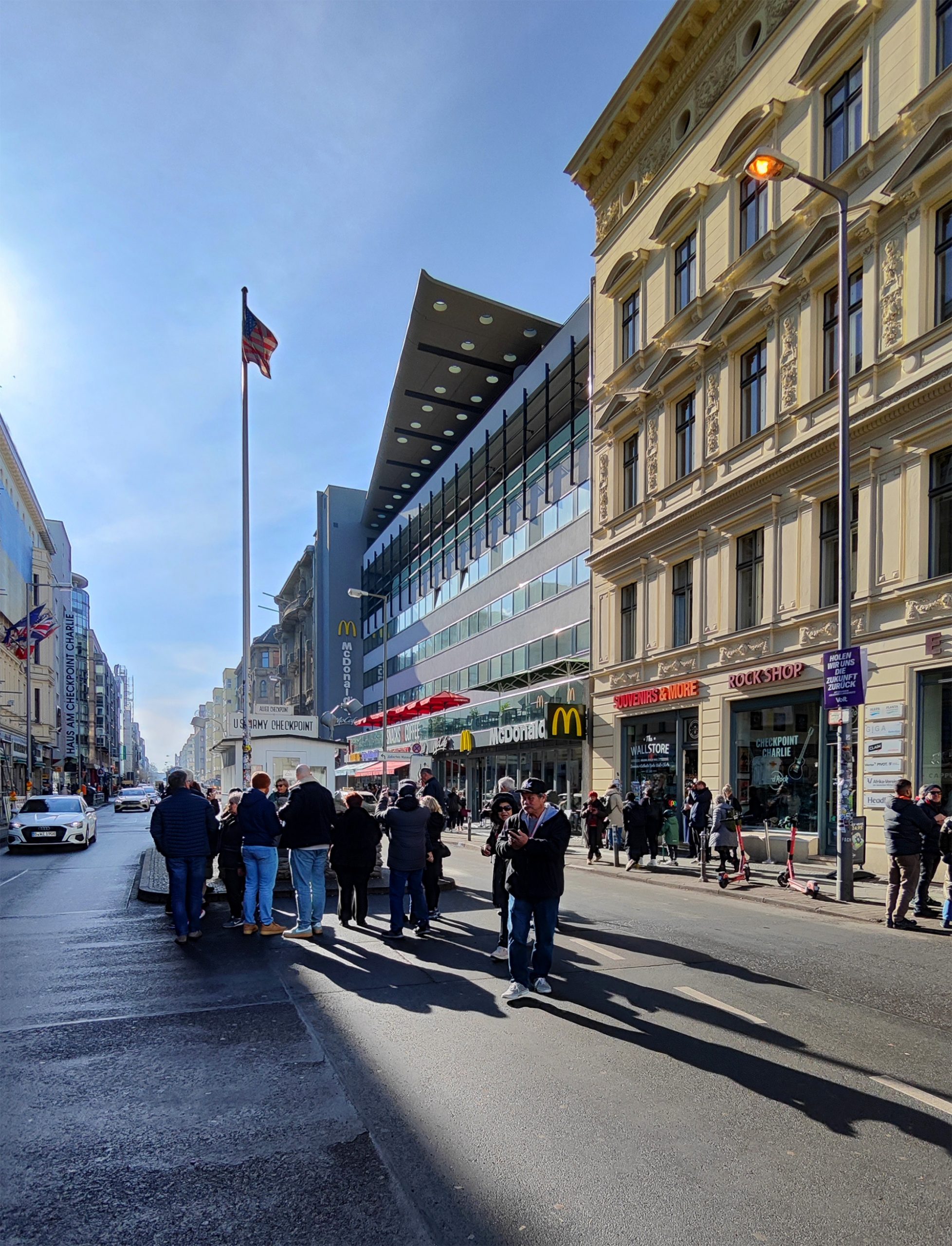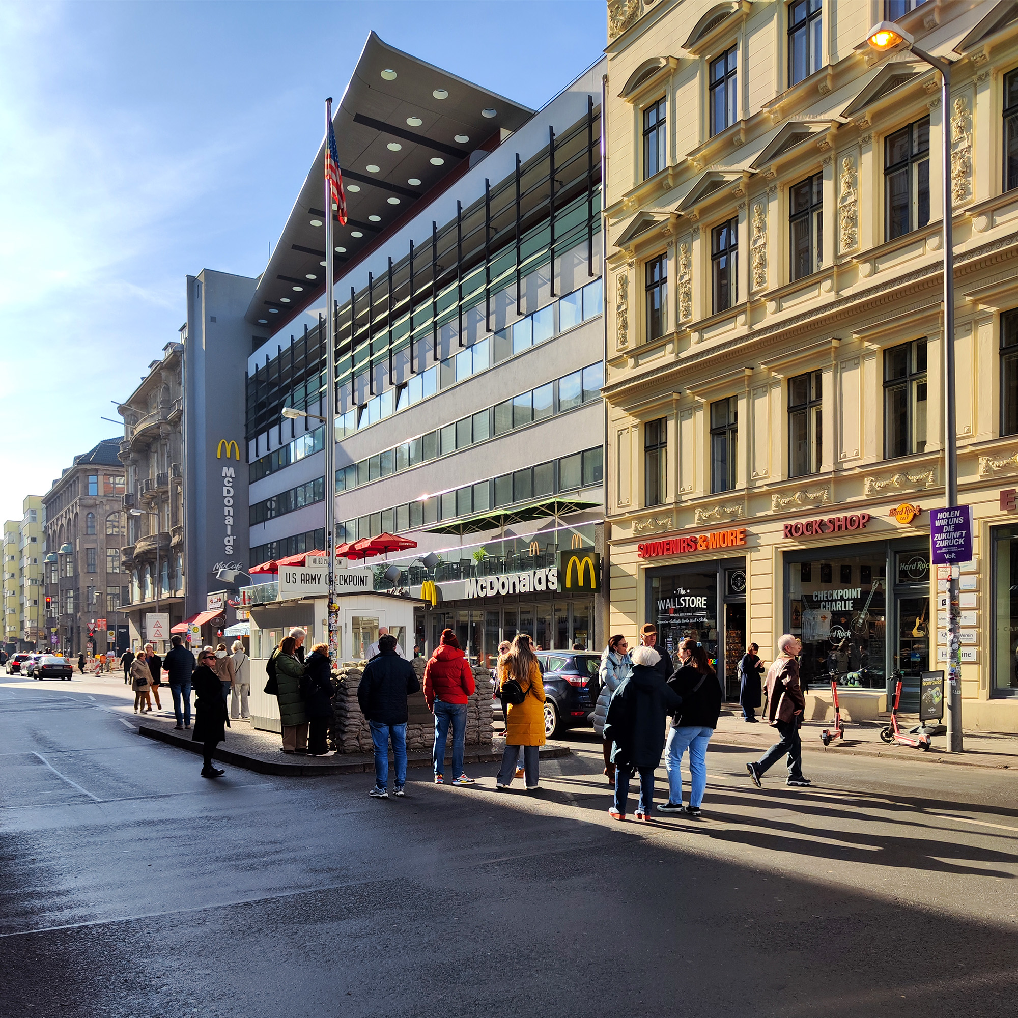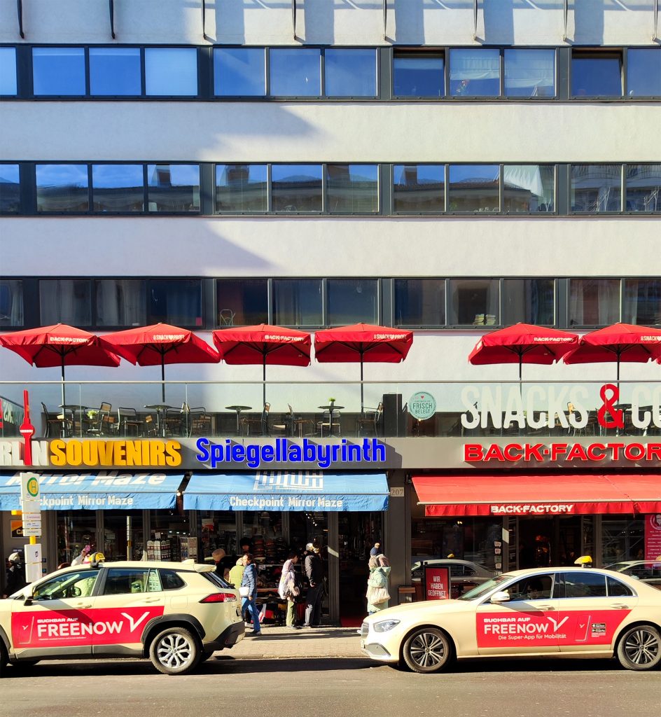 El encargo se basó en dos proyectos presentados por OMA al concurso Internationale Bauaustellung (IBA) en 1981. El programa incluye 26 apartamentos de tres tipos diferentes: 1. Áticos. 2. Apartamentos de tres plantas a los que se accede desde una galería de doble altura. 3. Dúplex con acceso al jardín. Los apartamentos se sitúan en un podio sobre las nuevas instalaciones del Checkpoint para los trabajadores de aduanas y las fuerzas aliadas. El edificio se terminó poco después de la caída del Muro de Berlín. El emplazamiento se encuentra en la zona barroca de Friedrichstadt, que ahora está dominada por los restos arquitectónicos del periodo anterior y posterior a la guerra, el Muro de Berlín y el Checkpoint (el paso fronterizo entre el este y el oeste para los no residentes). El proyecto aprovecha las cualidades latentes del emplazamiento. El edificio funciona como una serie de pabellones para el control fronterizo que forman un podio, con una «Miethaus» en la parte superior. Está elevado del suelo, separando las viviendas del Checkpoint y dejando el nivel de la calle para las actividades relacionadas con el control fronterizo, que penetran en la parte trasera del emplazamiento e incluyen un aparcamiento subterráneo.