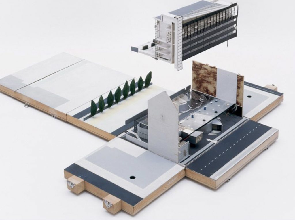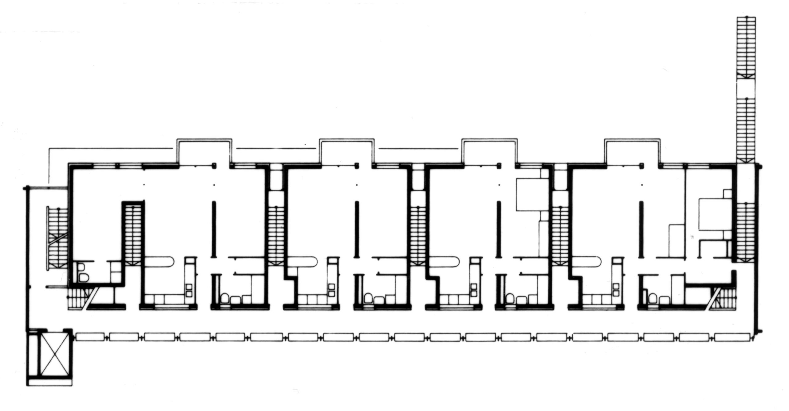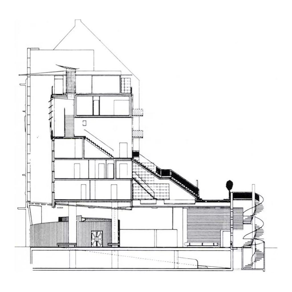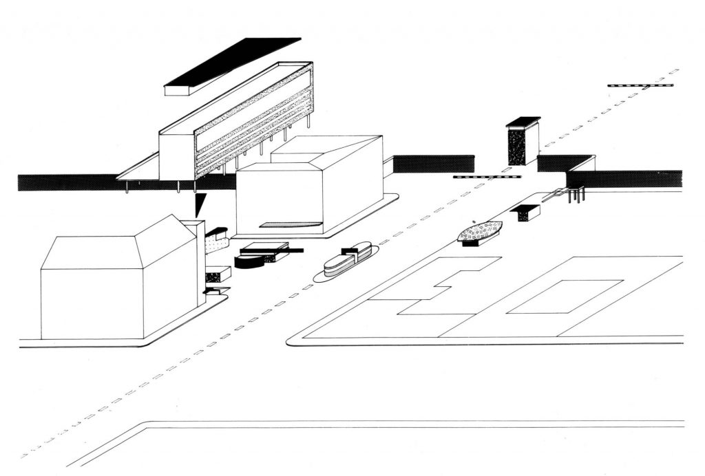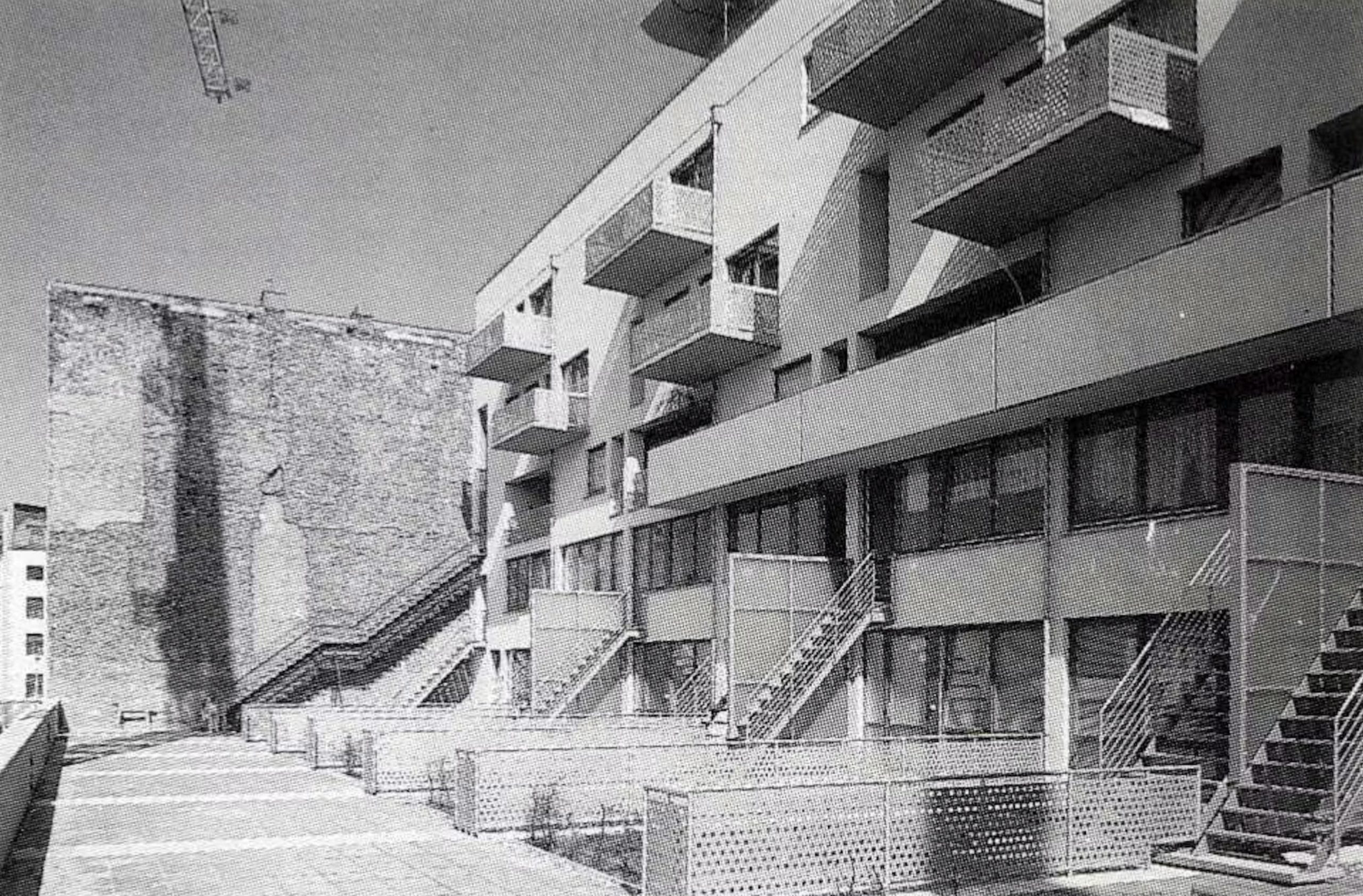 The commission followed two competition entries OMA submitted to the Internationale Bauaustellung (IBA) in 1981. The program includes 26 apartments which occur as three types: 1. Penthouses 2. Three floors of flats which are reached from a double-height gallery 3. Garden access maisonettes. The apartments sit on a podium above the new Checkpoint facilities for customs workers and Allied forces. The building was completed shortly after the Berlin Wall came down.The site is in the baroque area of Friedrichstadt, which is now dominated by the architectural remains of the pre- and post-war period, the Berlin Wall and the Checkpoint (the East/West border crossing for non-residents).The project exploits the latent qualities of the site. The building functions as a series of pavilions for border control which form a podium, with a ‘Miethaus’ on top. It is lifted off the ground, separating the housing from the Checkpoint and leaving the street level to activities related to border control, which penetrate to the back of the site and include an underground car park.