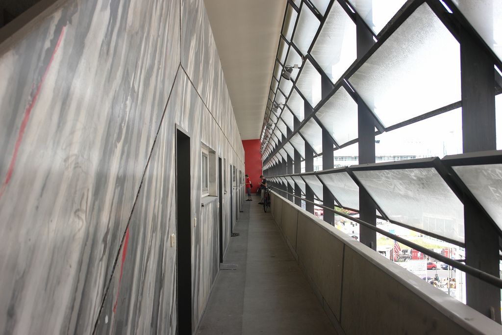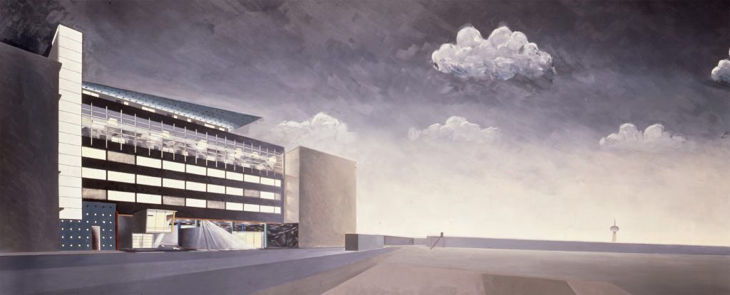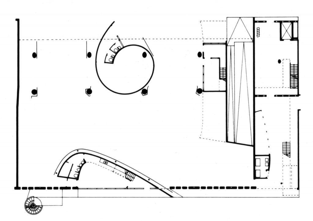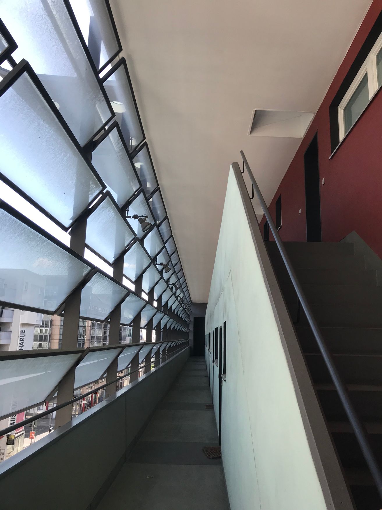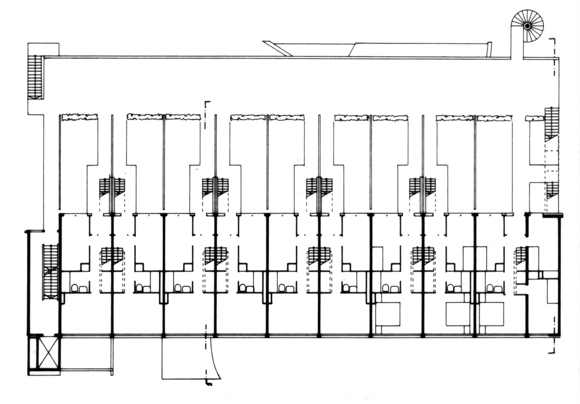 The commission followed two competition entries OMA submitted to the Internationale Bauaustellung (IBA) in 1981. The program includes 26 apartments which occur as three types: 1. Penthouses 2. Three floors of flats which are reached from a double-height gallery 3. Garden access maisonettes. The apartments sit on a podium above the new Checkpoint facilities for customs workers and Allied forces. The building was completed shortly after the Berlin Wall came down.The site is in the baroque area of Friedrichstadt, which is now dominated by the architectural remains of the pre- and post-war period, the Berlin Wall and the Checkpoint (the East/West border crossing for non-residents).The project exploits the latent qualities of the site. The building functions as a series of pavilions for border control which form a podium, with a ‘Miethaus’ on top. It is lifted off the ground, separating the housing from the Checkpoint and leaving the street level to activities related to border control, which penetrate to the back of the site and include an underground car park.