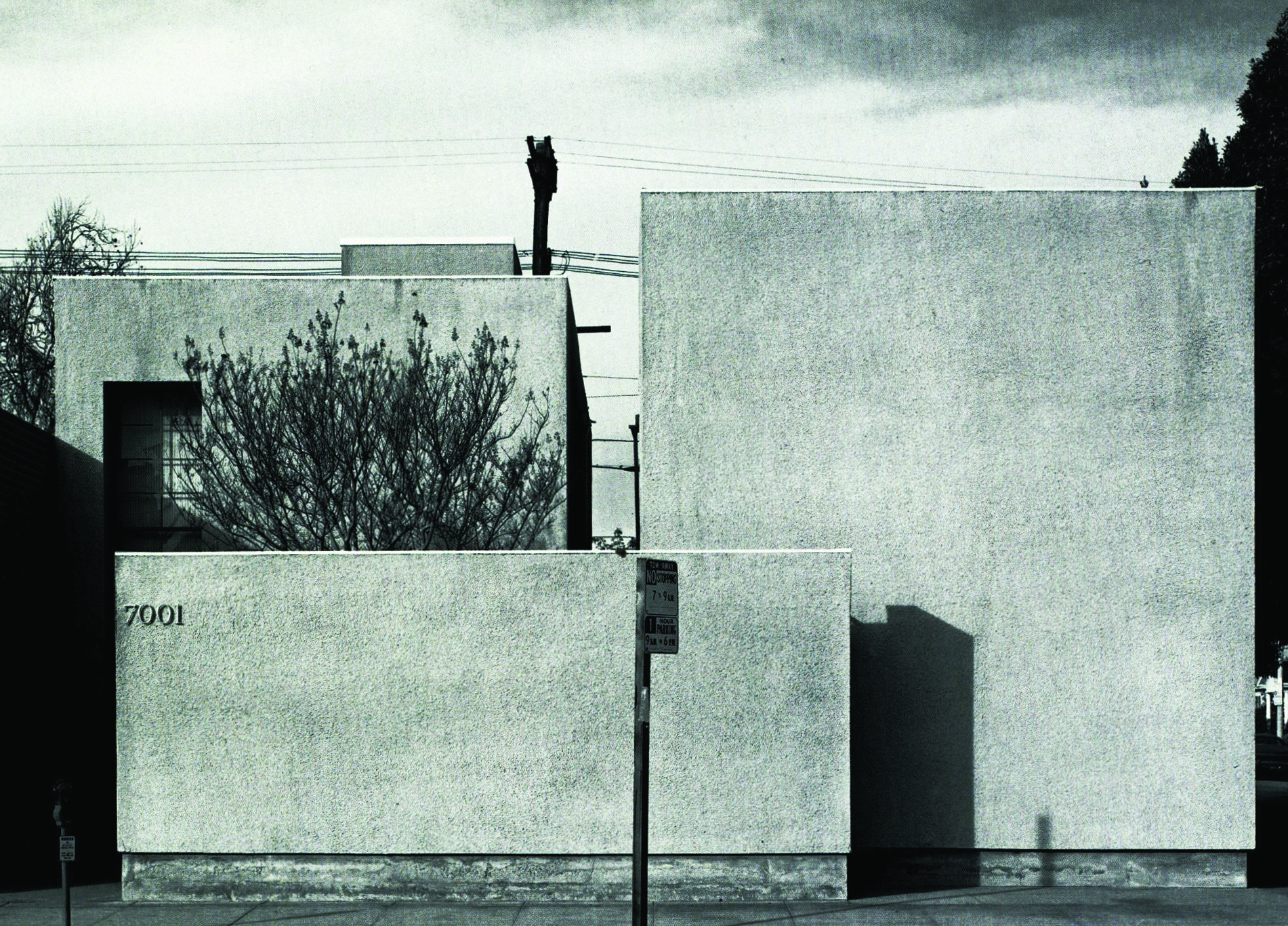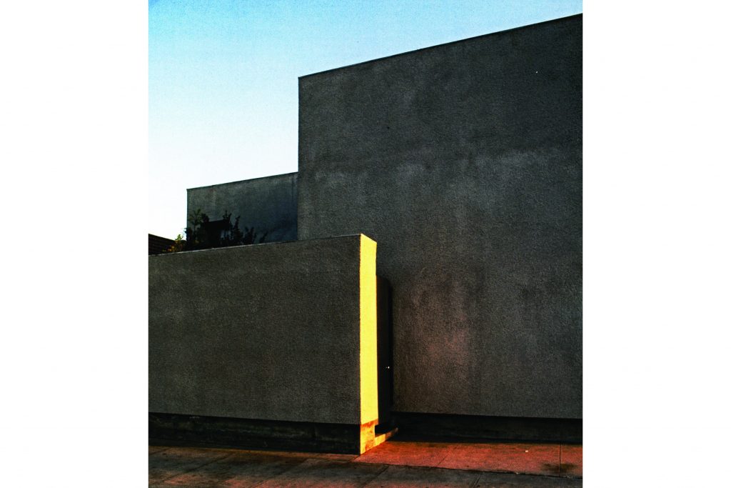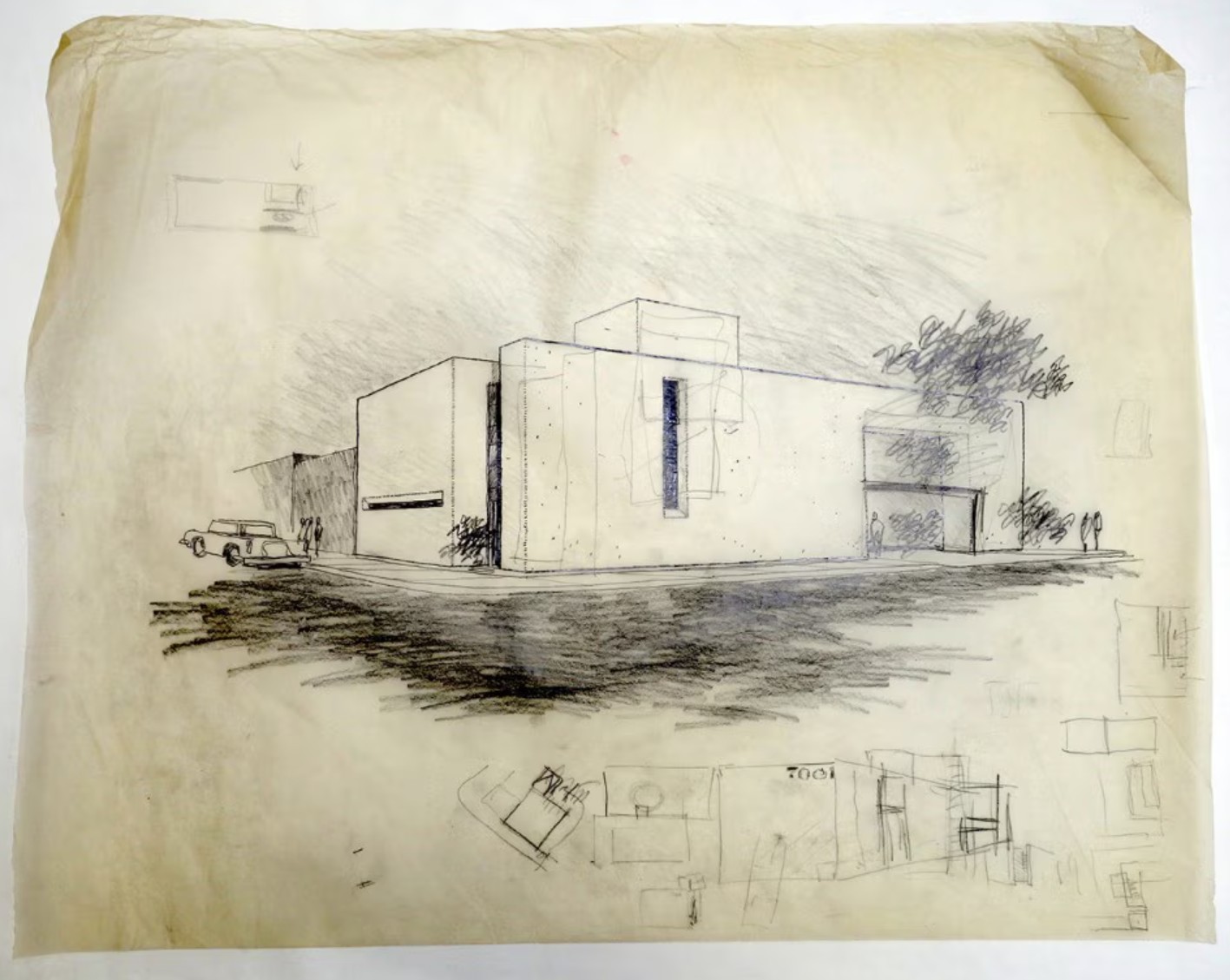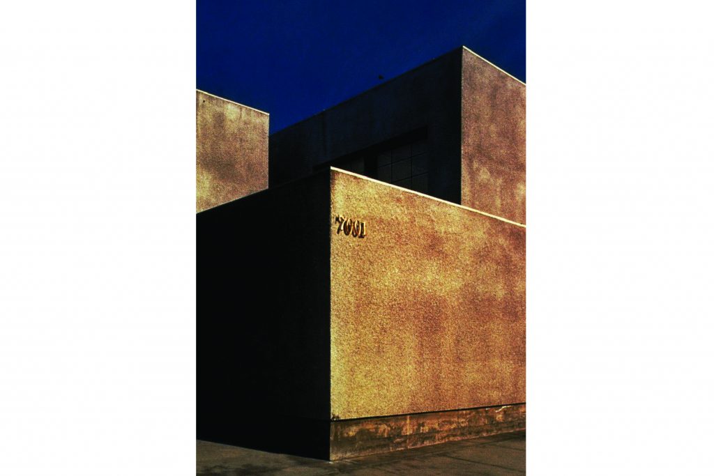 On a busy corner of Melrose Avenue, in a neighbourhood where printers and other businesses of the graphic trades abounded, Danziger’s idea was thus to build a 1,000-square-foot studio along with the 1,600-square-foot townhouse, contained in a single building. The first sketches reflect this unitary principle. Walsh affirms that “the big epiphany for me was when we pulled the two elements apart. For the first time we had two pieces on a single site.” From the beginning, the pressure of traffic in this area of Hollywood led to enclosed volumes, with a minimal number of windows opening directly onto the roads. The narrative written in 1970 by the office to support the application to an AIA Award is explicit: “The dirty, noisy and totally public nature of the surroundings necessitated completely introverting and screening the building from the street. The solution was a fortress-like structure, recessed from the street, with the residence portion sequestered behind a high wall.”