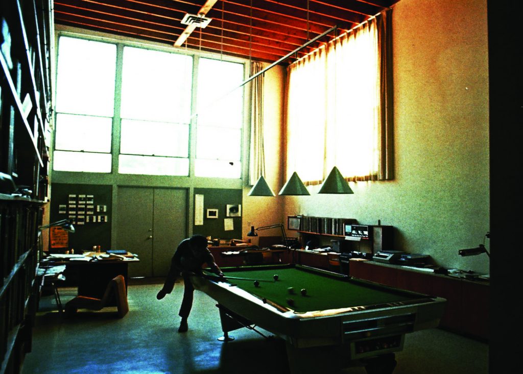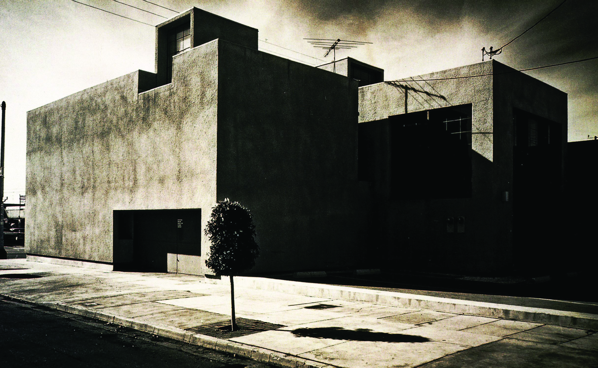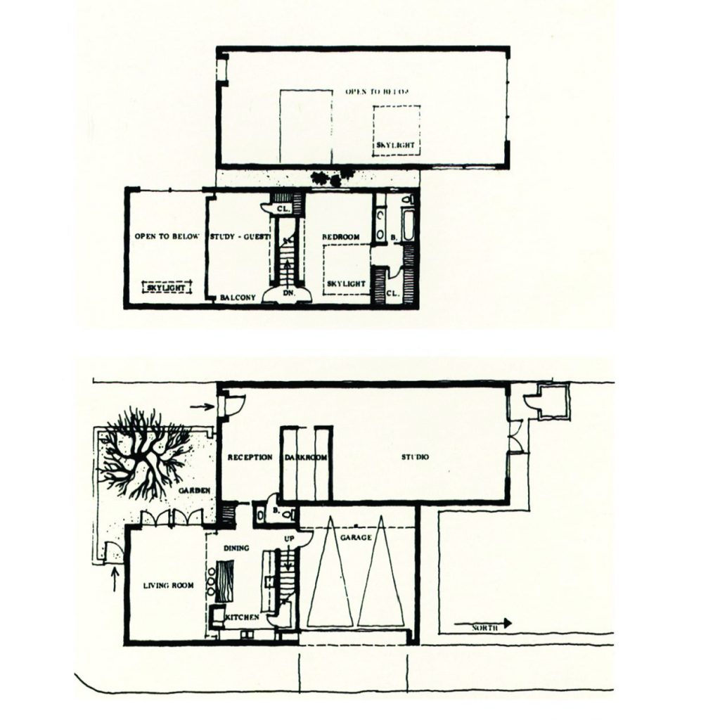 On a busy corner of Melrose Avenue, in a neighbourhood where printers and other businesses of the graphic trades abounded, Danziger’s idea was thus to build a 1,000-square-foot studio along with the 1,600-square-foot townhouse, contained in a single building. The first sketches reflect this unitary principle. Walsh affirms that “the big epiphany for me was when we pulled the two elements apart. For the first time we had two pieces on a single site.” From the beginning, the pressure of traffic in this area of Hollywood led to enclosed volumes, with a minimal number of windows opening directly onto the roads. The narrative written in 1970 by the office to support the application to an AIA Award is explicit: “The dirty, noisy and totally public nature of the surroundings necessitated completely introverting and screening the building from the street. The solution was a fortress-like structure, recessed from the street, with the residence portion sequestered behind a high wall.”