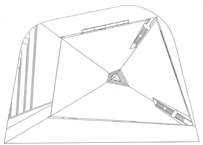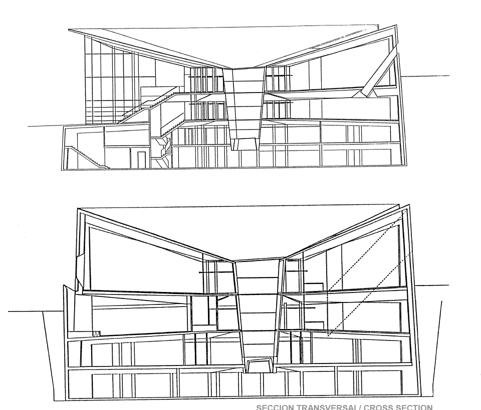 In spite of the difficulties of the land’s steep slope and its trapezoidal form, it has given rise to new, unusual and highly original architectural forms. thus, the building was conceived as an inverted container, focused towards the exterior. This is manifest in the way all the ceilings of the library, except the second cellar floor, are slightly inclined. this reaches its maxim level, 36 degrees, with the roof of the building.