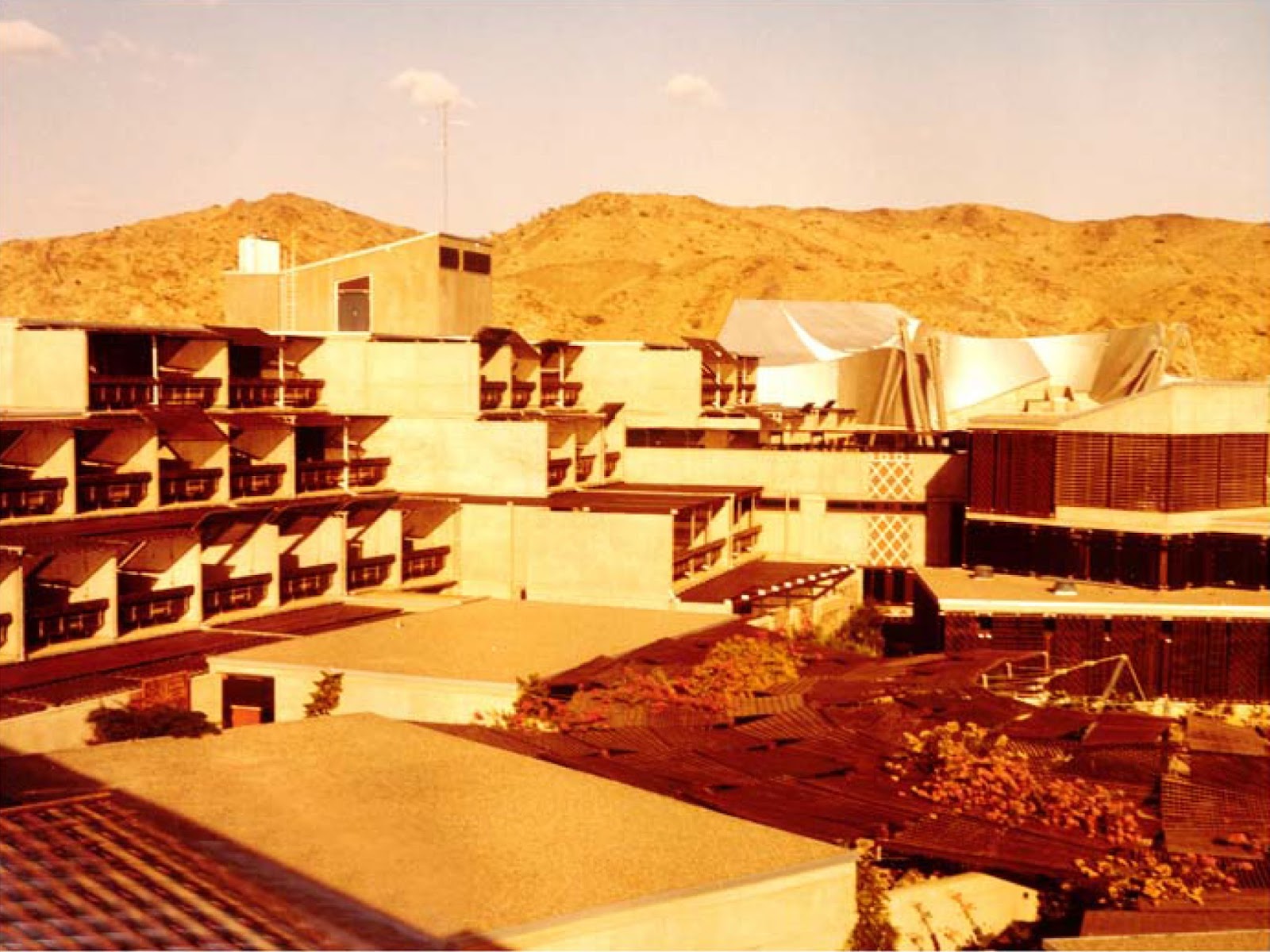 In 1966 the Saudi Arabian Ministry of Finance sponsored an international competition for the design of a conference centre with hotel and mosque. The German team of Rolf Gutbrod and Frei Otto won the competition. Their design, inspired by Bedouin tents, proposed an enormous tent structure which would shelter beneath it an artificial oasis surrounded by the conference facilities and hotel rooms. The tent structure, marked at the centre by a 60-metre-high mast carrying a water tank, would have been open at the sides and top, permitting air to flow in and vent upward. After the competition the architects were asked by the ministry to develop their scheme for a different site, one located four miles west of Mecca, along a dry wadi bed, surrounded by the rugged Sirat hills. The winning design which had been suitable for the flat desert site near Riyadh was no longer appropriate. The new site’s proximity to the holy city and the surrounding rugged terrain suggested a different solution, one less obtrusive and more in harmony with the landscape.