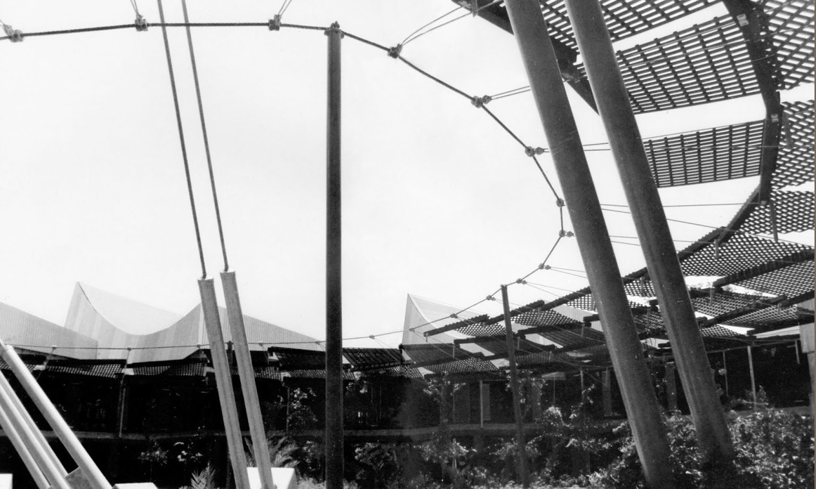 En 1966, el ministro de finanzas de Arabia Saudí patrocinó un concurso internacional para el diseño de un centro de conferencias con hotel y mezquita en la ciudad de la Meca que ganó el equipo alemán formado por Rolf Gutbrod y Frei Otto. El diseño, inspirado en las tiendas de los beduinos, proponía una enorme estructura tensada la cual acogería un oasis artificial rodeado por las instalaciones del centro de conferencias y las habitaciones del hotel. La estructura tensada, organizada radialmente por un mástil de 60 metros de alto, tenía un tanque de agua, abriéndose hacia los lados y la parte superior, ventilaría para mantener una temperatura constante. Tras el concurso, el ministerio de finanzas decidió mover la propuesta a otro lugar, cuatro millas al oeste de la meca, rodeado por las colinas escarpadas del Sirat. La propuesta ganadora del concurso ya no funcionaba en el nuevo solar por lo que se adaptó para al accidentado terreno y más integrado en el paisaje.