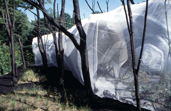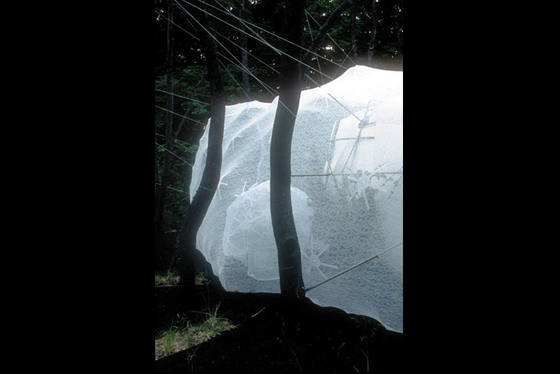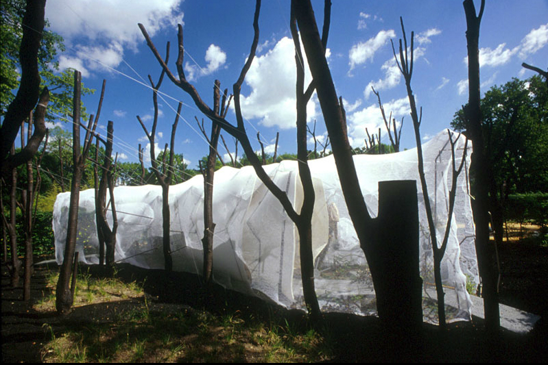 El pabellón juega con los contrastes entre la artificialidad de la naturaleza y la construcción de elementos orgánicos. El  primer síntoma aparece al acercarse por el jardín: tiras de césped plantado, destacan sobre el bosque de árboles carbonizados. El propio pabellón es una crisálida blanca construida con encajes de tela; al entrar, el visitante se encuentra con unos tubos metálicos donde se apoya el cultivo individualizado de hongos, hay más de 250 especies distintas. Un verdadero jardín artificial y micro-paisaje individualizado, construido sobre una naturaleza ficticia.