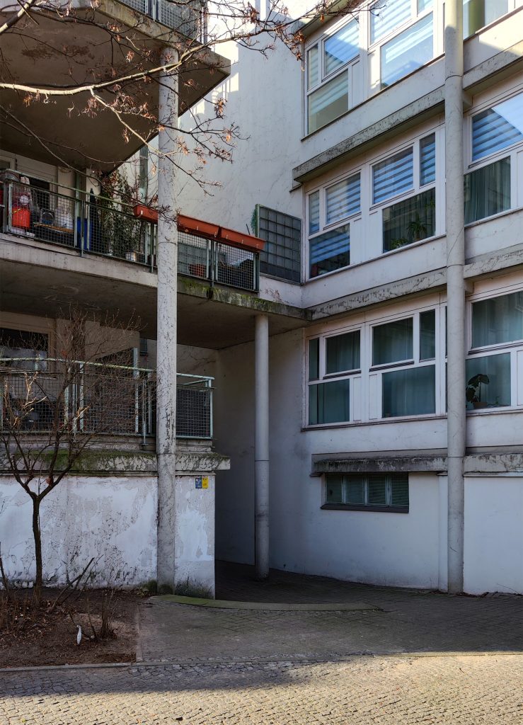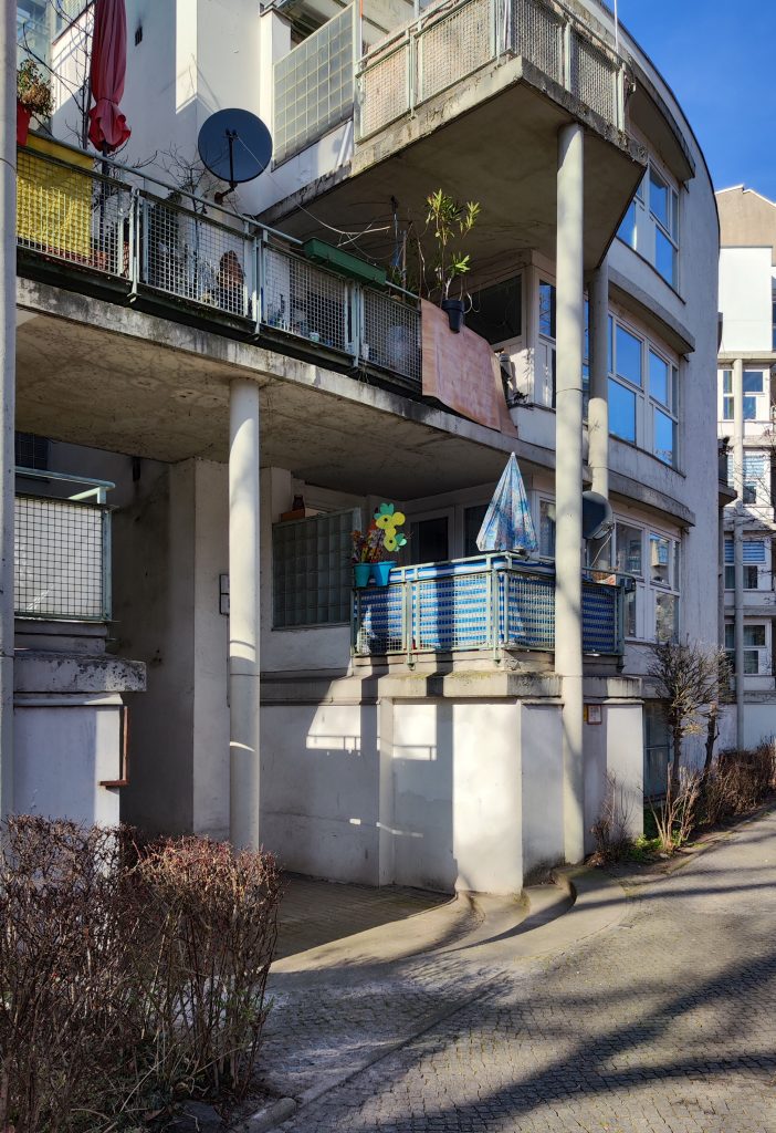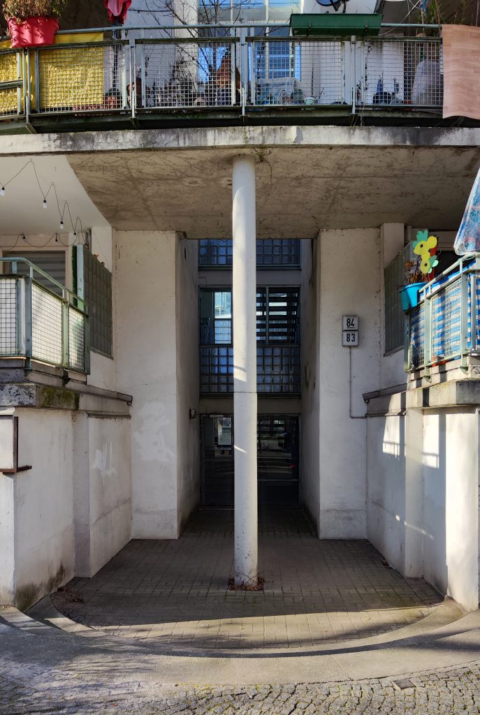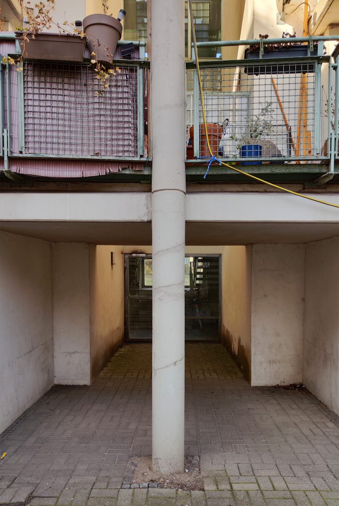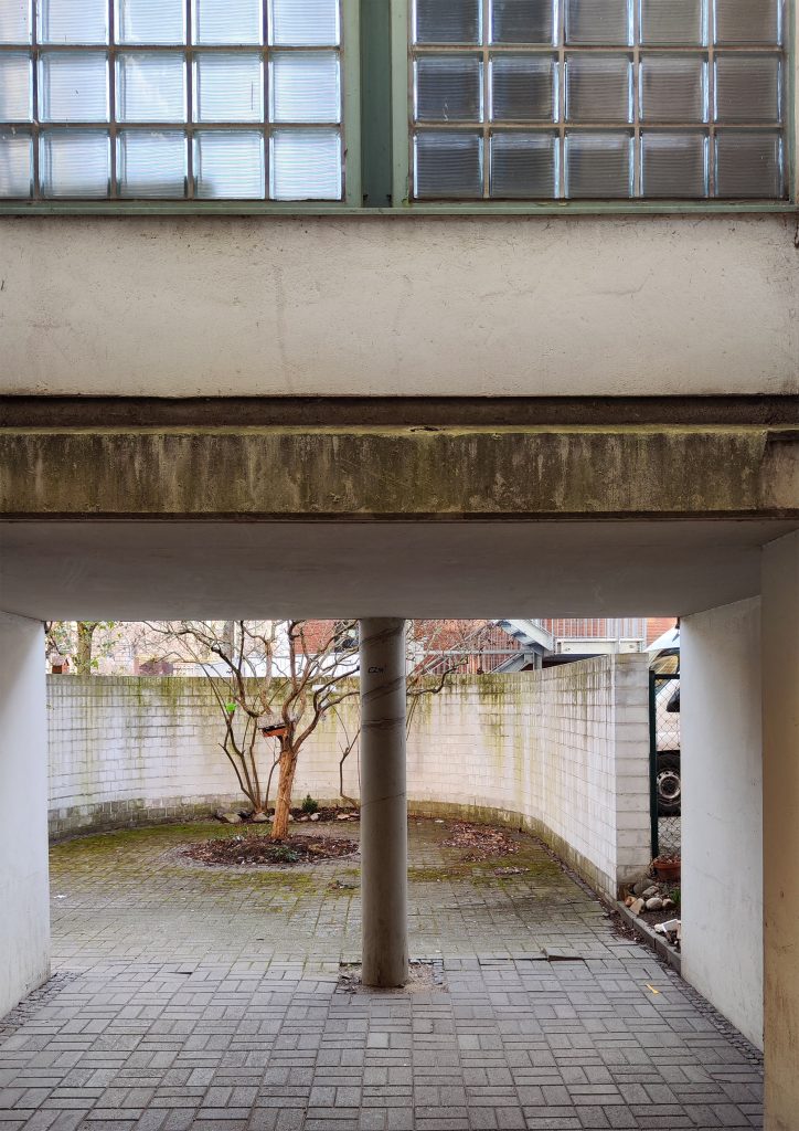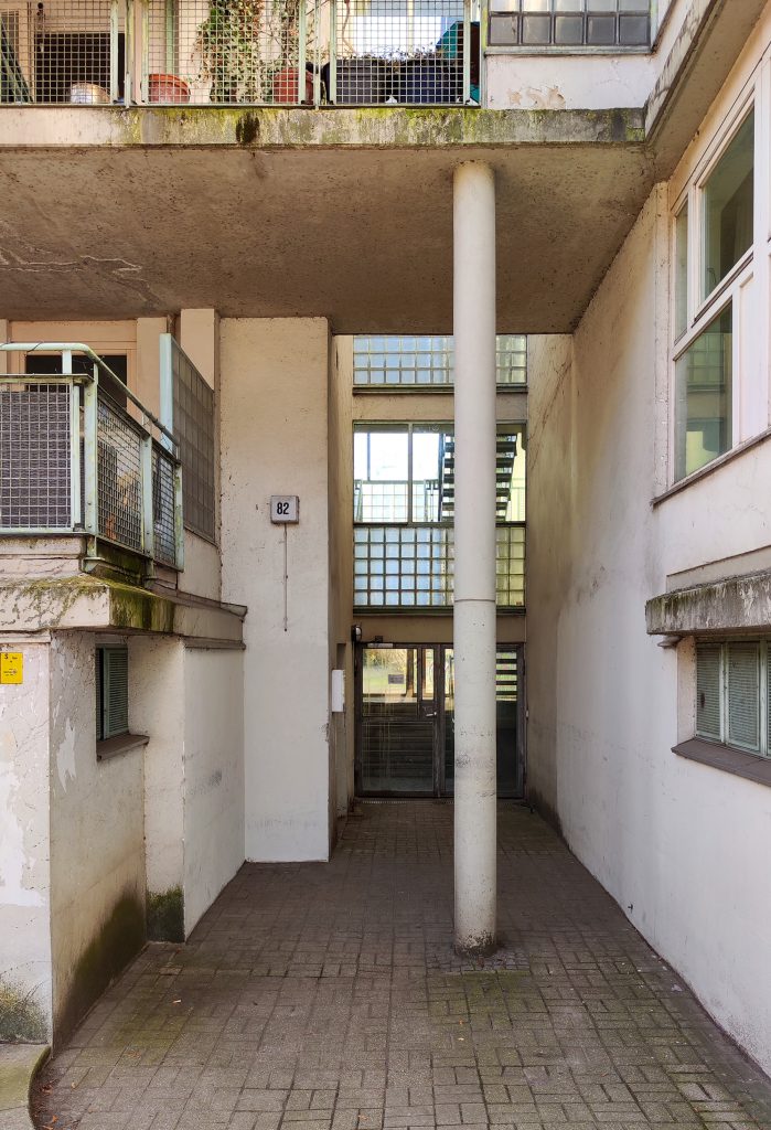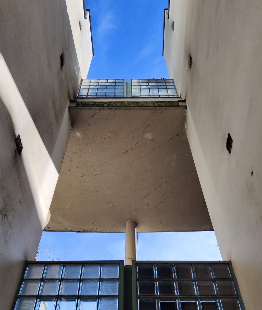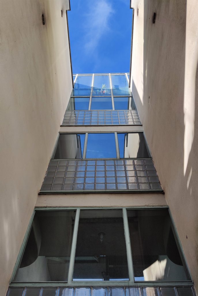 Five of these skylight-lit passages connect the new semi-circular courtyard with the adjacent streets, while the other two connect the same courtyard with the now enclosed courtyard behind the existing housing blocks to the north, allowing access for both the public and residents. Unlike the steel-framed, glass-walled staircases, the dwellings are constructed of concrete structures with cylindrical beams and columns, concrete slabs and load-bearing walls of concrete blocks, clad with white stucco on the outside and white plaster on the inside. They feature white-painted wooden-framed windows, glass screens, steel railings and metal mesh parapets.