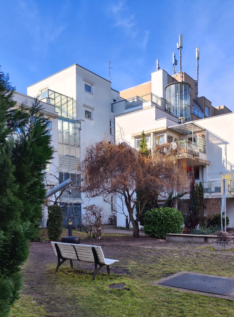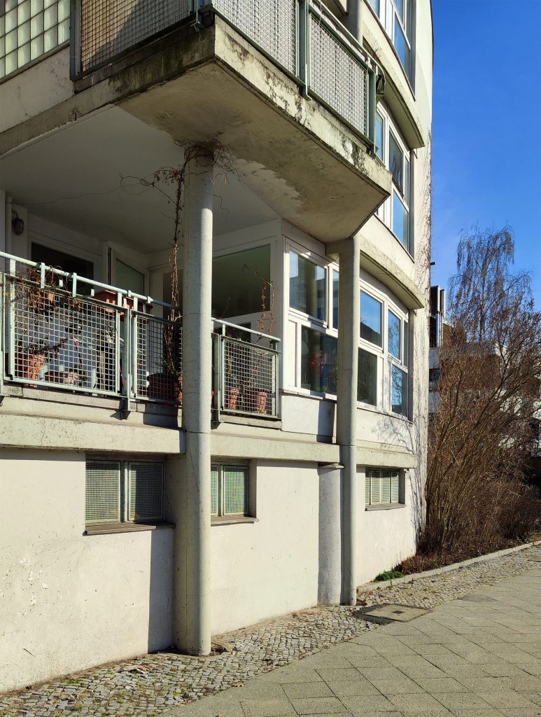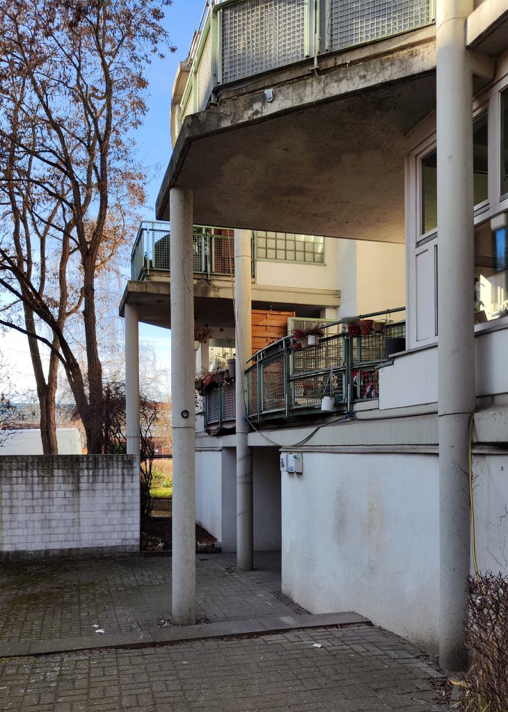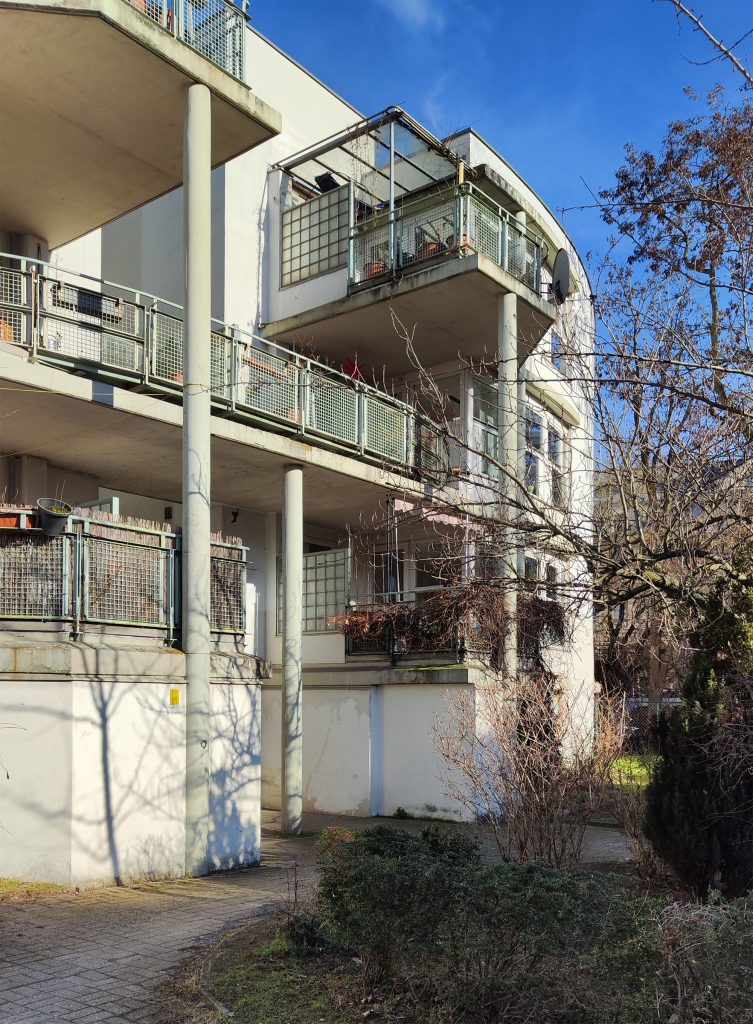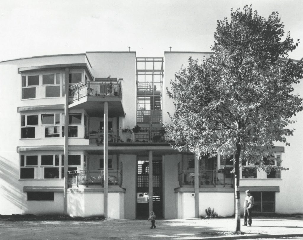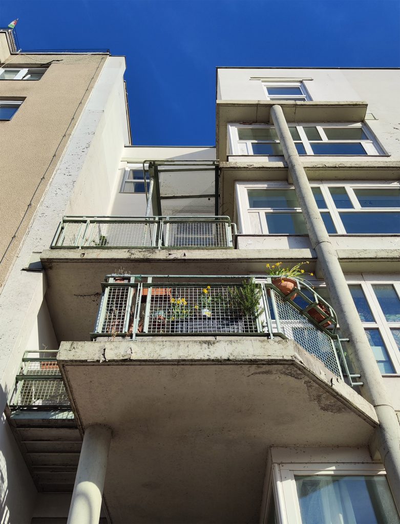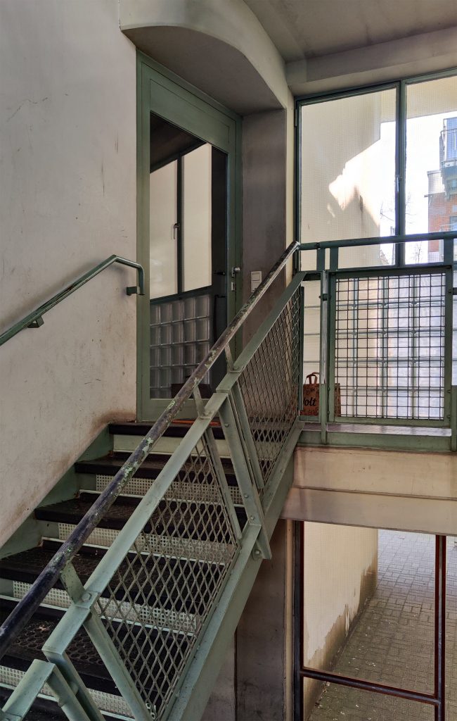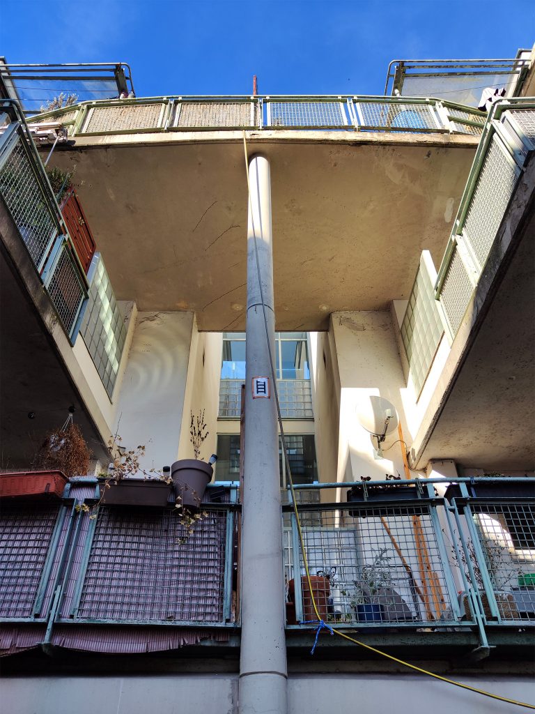 Five of these skylight-lit passages connect the new semi-circular courtyard with the adjacent streets, while the other two connect the same courtyard with the now enclosed courtyard behind the existing housing blocks to the north, allowing access for both the public and residents. Unlike the steel-framed, glass-walled staircases, the dwellings are constructed of concrete structures with cylindrical beams and columns, concrete slabs and load-bearing walls of concrete blocks, clad with white stucco on the outside and white plaster on the inside. They feature white-painted wooden-framed windows, glass screens, steel railings and metal mesh parapets.