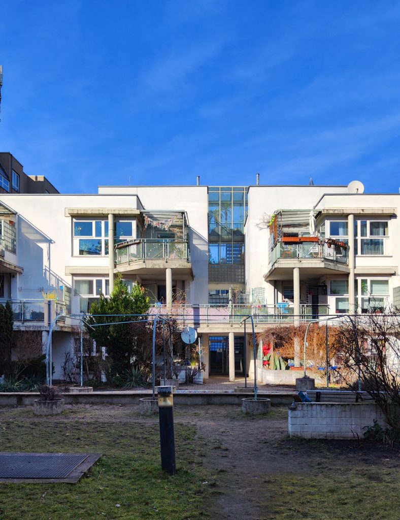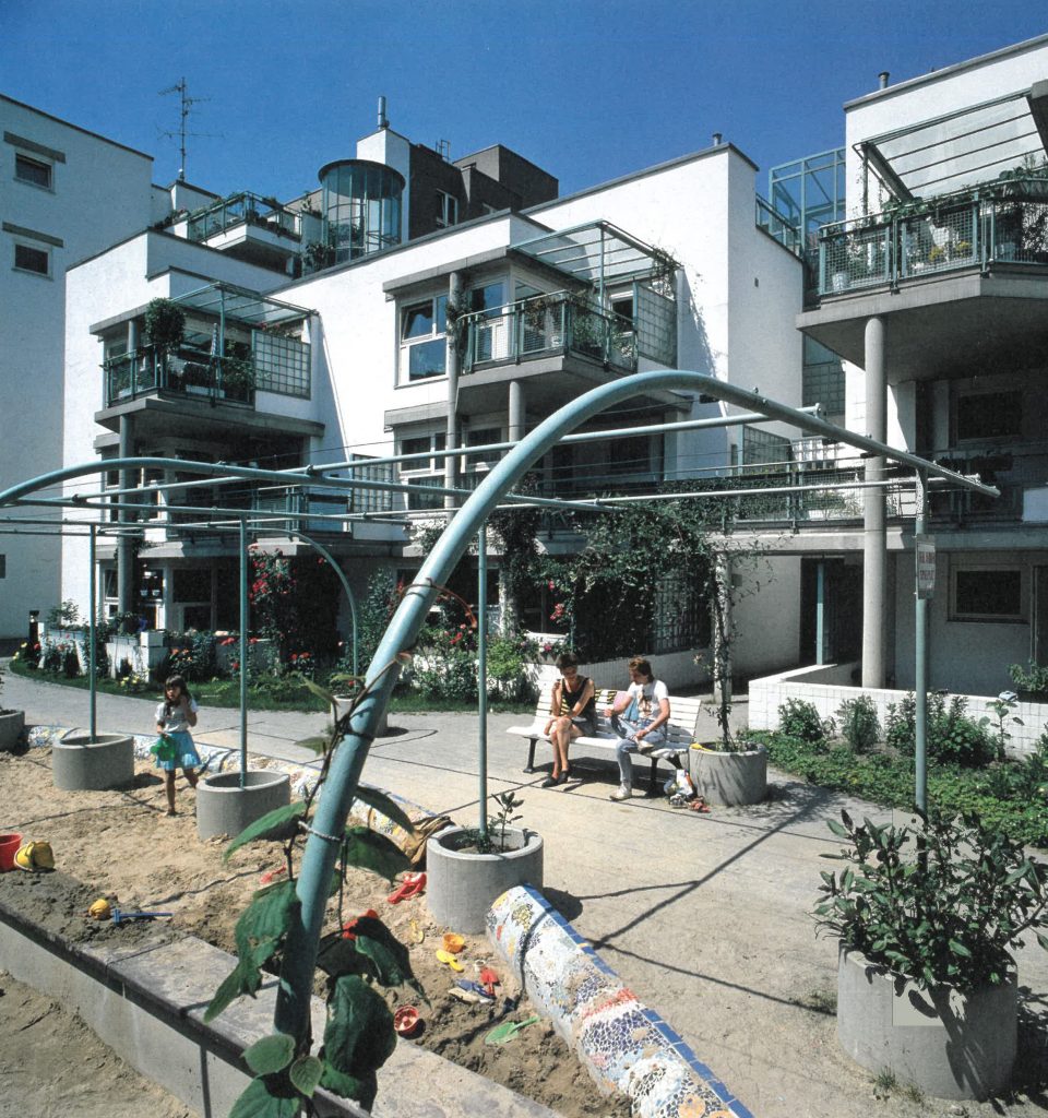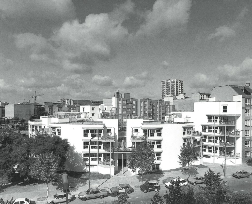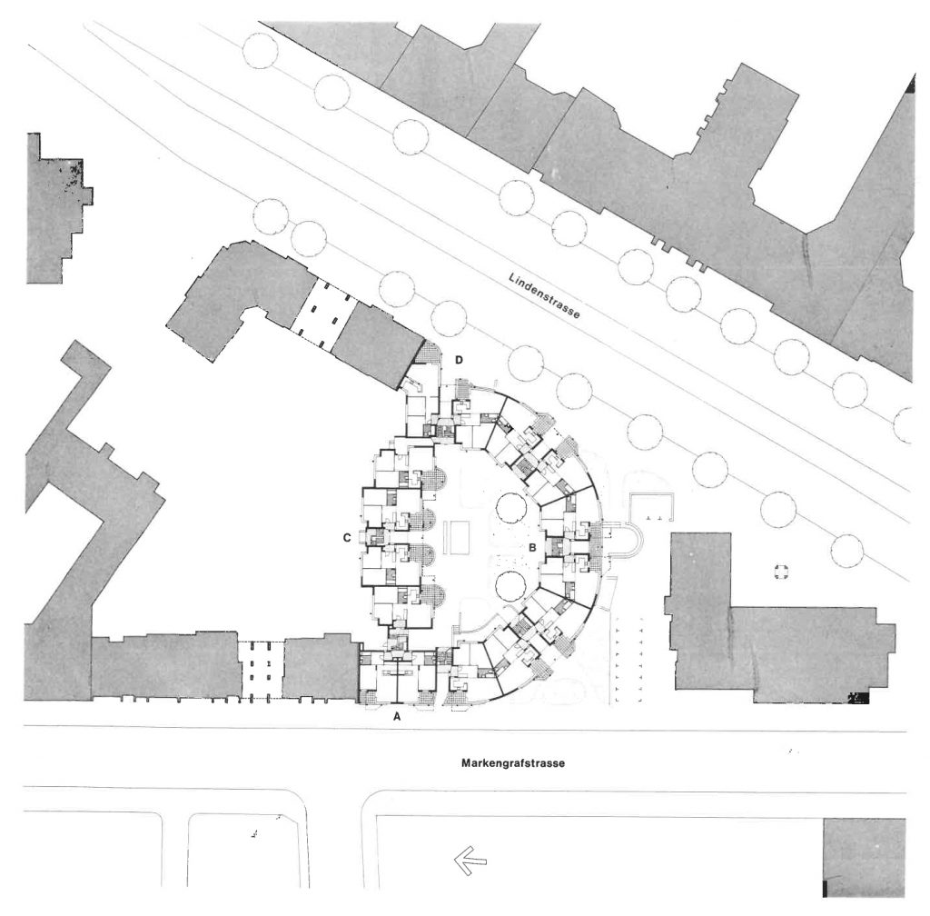 The project is located on a triangular site between Lindenstraße to the east and Markgrafenstraße to the west (hence LiMa), which also has an existing church on the south corner and existing dwellings to the north along both streets. The plan takes the form of a stepped wall of dwellings connecting the two existing housing blocks to the north, thus enclosing the courtyard between them, and a semi-circular ring of dwellings wrapping around the south side of the site, forming a new semi-circular courtyard and allowing the existing church to remain a structure independent of the housing fabric.The seven staircases with glass walls and roofs that connect the pairs of three-storey dwellings are experienced as vertical streets, leading to the apartment entrances and the glass-covered communal terraces on the roof, and to horizontal urban passages at street level in the tradition of 19th-century European glass-roofed arcades, such as Hertzberger’s favourite, the Passage des Panoramas in Paris.