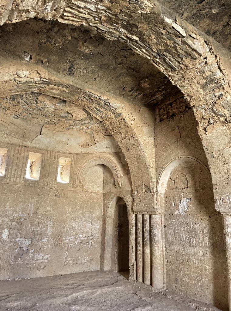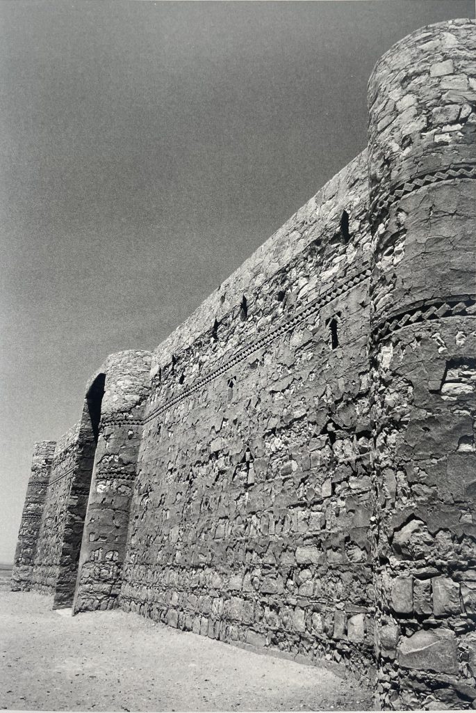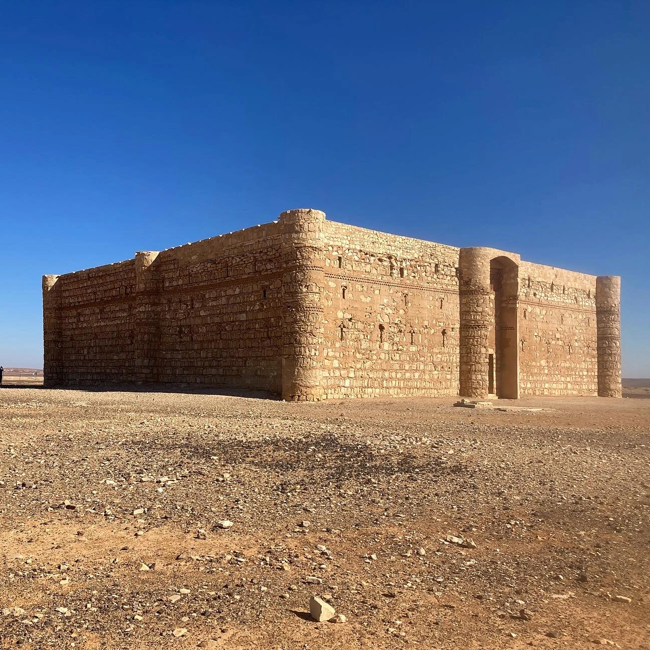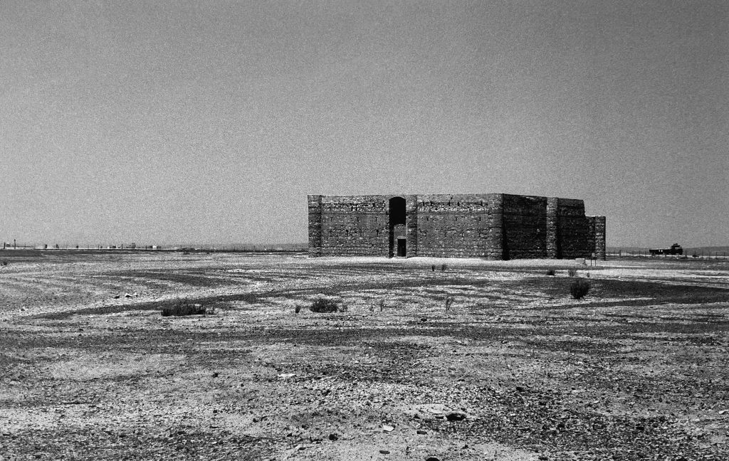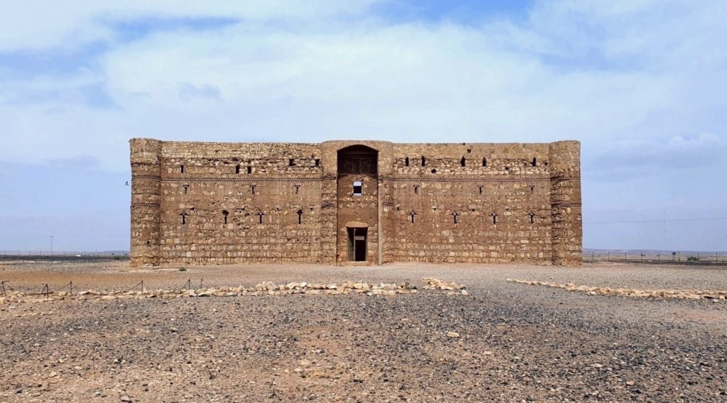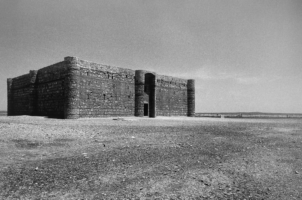The Qasr al-Harrana (also known as Qsar Kharana) is one of the best-preserved caravanserais in Jordan, especially because it was built in the year 710. Located in the desert, about sixty-five kilometers east of Amman, halfway on the road to Azraq, and fifteen meters above the nearby wadi, or channel that only gets water during the rainy season, and connected to Wadi Sirhan in the Arabian Peninsula. It is roughly a square of 115 feet on each side, has two floors, and in its corners, an entrance has a series of solid towers to give the appearance of a powerful fortress, although they had no functional or defensive purpose. Visitors arriving at the caravanserai had to pass through a single large door, wide enough for camels to enter. Inside, a scribe recorded their names, hometowns, types of goods, and livestock counts. They then entered the courtyard, which was preceded by two large rooms, presumably used as camel stables and storage areas.