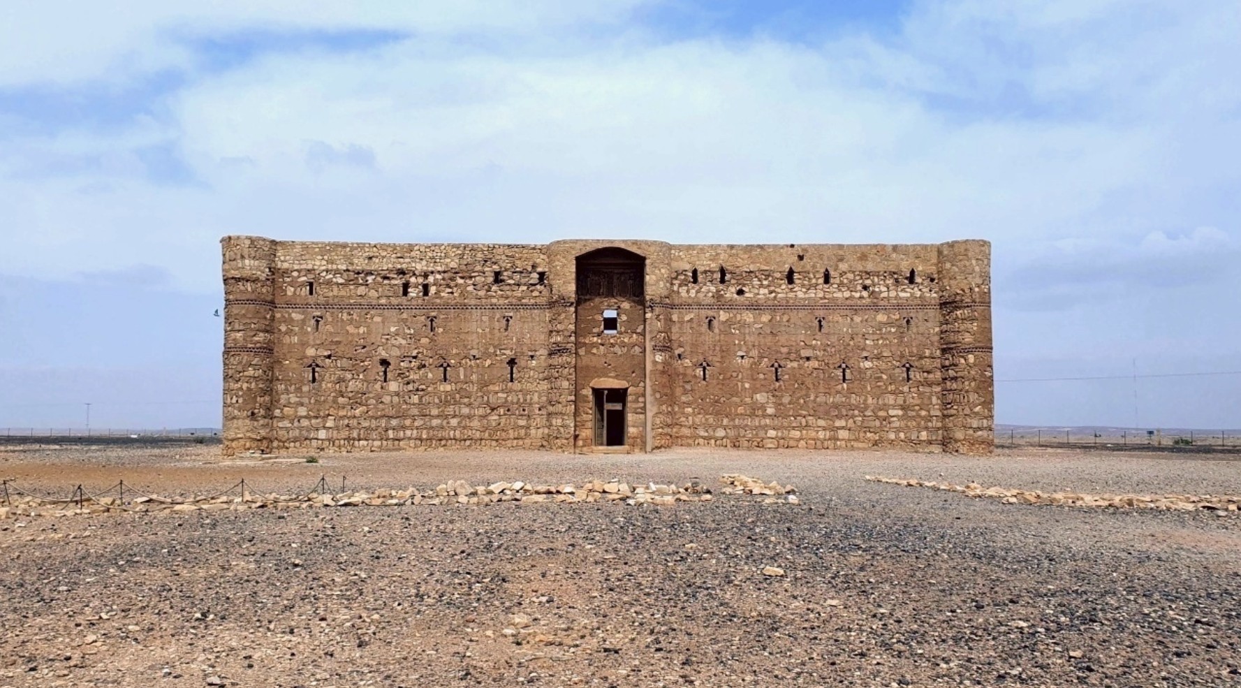 El Qasr al-Harrana (también conocido como Qsar Kharana) es uno de los caravansares mejor conservados de Jordania, especialmente considerando que fue construido en el año 710. Ubicado en el desierto, a unos sesenta y cinco kilómetros al este de Amán, a mitad de camino hacia Azraq, y a quince metros sobre el cauce cercano, que solo lleva agua durante la temporada de lluvias y conecta con el gran cauce de Sirhan en la península arábiga. Tiene una planta aproximadamente cuadrada de 35 metros de lado y dos pisos. En sus esquinas y en la entrada, este muro está flanqueado por una serie de sólidas torres que le dan la apariencia de una poderosa fortaleza, aunque no tenían ninguna función defensiva. Los visitantes que llegaban al caravasar debían pasar por una única puerta, lo suficientemente ancha como para que entraran los camellos. Dentro, un escriba registraba sus nombres, lugares de origen, tipos de mercancías y el número de animales. Luego accedían al patio interior, precedido por dos grandes salas, presumiblemente utilizadas como establos para camellos y almacenes.