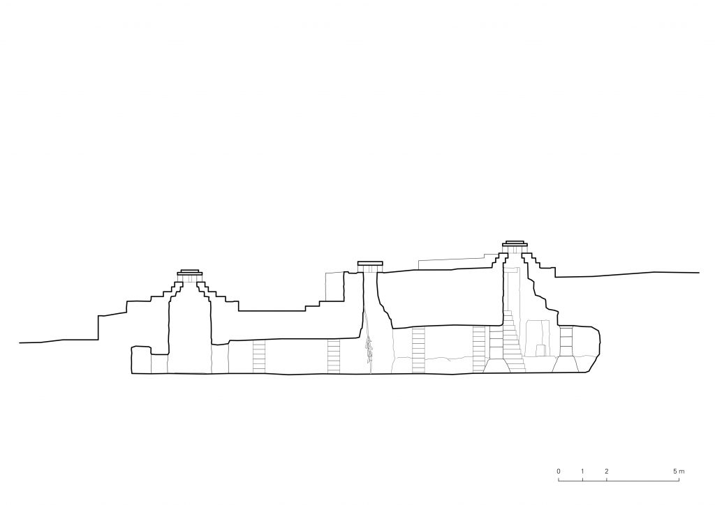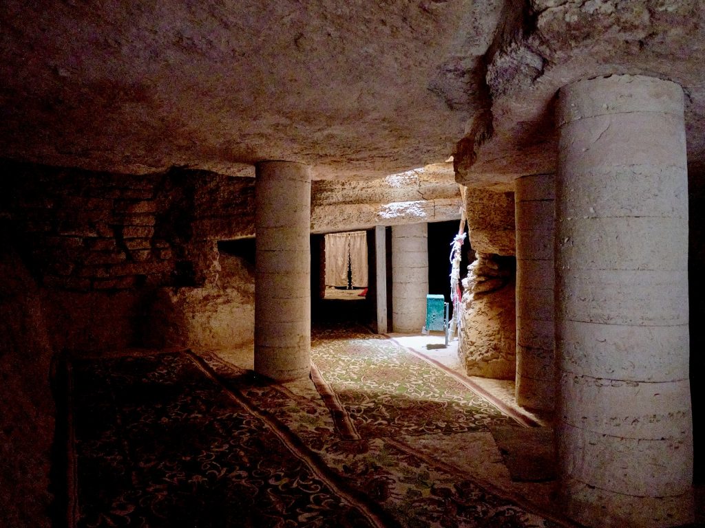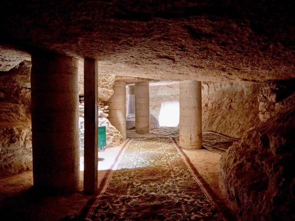 The mosque’s continuous, narrow space is shaped by pillars that bear different heights of the rock ceiling. Its natural light, coming through the skylights and reverberating off the limestone internal surfaces, mainly defines and characterizes the mosque’s unique atmosphere. The praying spaces are so defined by natural light, which creates contrast with the overall darkness and enhances the sense of sacredness.