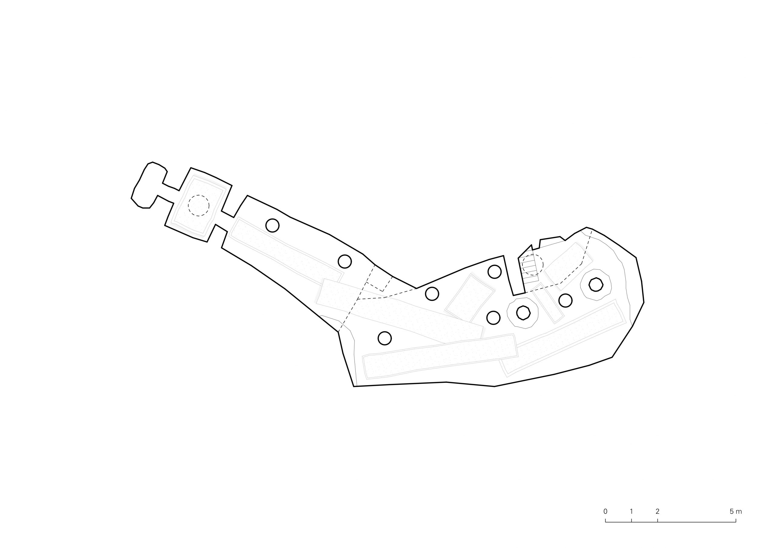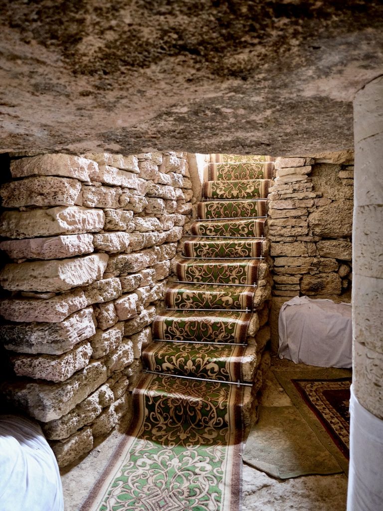 Approaching the sacred site, the visitor passes by a couple of low limestone rock constructions, from which circular skylights protrude, bringing light into the underground space. The path goes down and finally reaches the entrance: a simple door leading down to the inner sacred space.