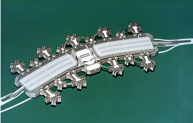 Two primary circulation corridors connect office areas to a central building where services such as medical, shopping, dining and meeting rooms, the executive offices, and boardrooms are located. The central building also contains the visitors’ entrance, which is accessible by two 30-foot roadways that run through the building and provide fire separation and ventilation between offices and parking.