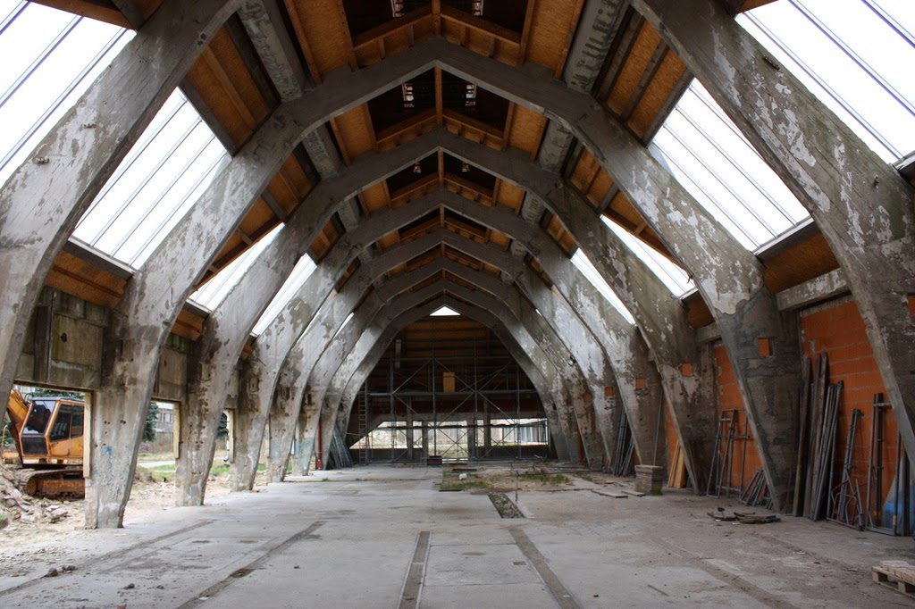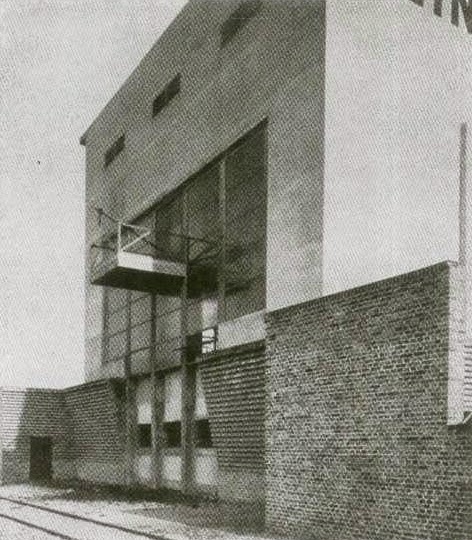 This is the first industrial plant built by Mendelshon. Lying on an elongated site, the factory consists of a plurality of buildings in order to allow the dual production of felt and wooden hats. At the centre of the plant are the sheds used for wet processing, the dye works and the power station. Construction took place in three stages: a) the sheds and the dye works, which could be extended on both sides; b)the power station with the boiler and the turbine house, lying beside a railway siding; c)the acces road and the gatehouse. The finished products store beside the entrance was never built. The structure is in reinforced concrete girders with brick curtain walls; the roof was covered with a rubber-coated surface.