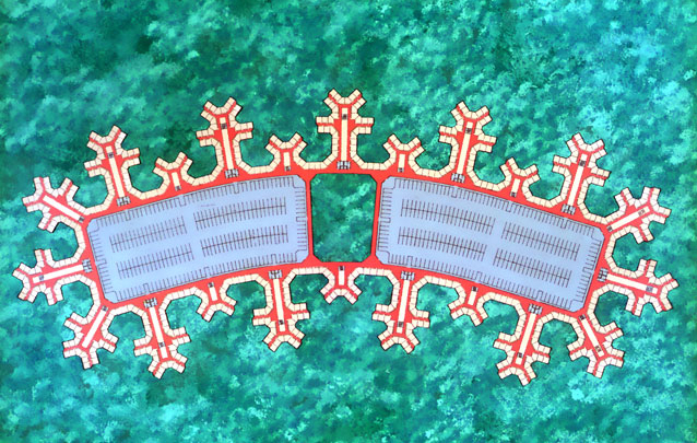 Two primary circulation corridors connect office areas to a central building where services such as medical, shopping, dining and meeting rooms, the executive offices, and boardrooms are located. The central building also contains the visitors’ entrance, which is accessible by two 30-foot roadways that run through the building and provide fire separation and ventilation between offices and parking.